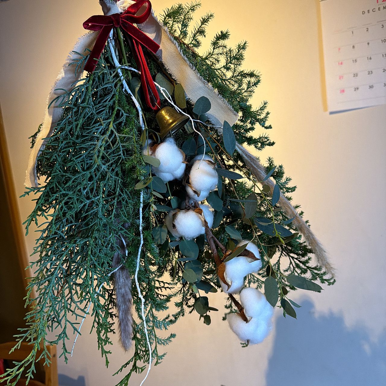 初めて作りましたが、難しくもあり 楽しく作れました。 香りが本当に良くてやっぱり生花は良いですね! ボリュームがあったので、残った分で小さいスワッグも作れました。コットンキャンディーは自宅にあったので一緒にして作りました。 リボンの赤い色がグリーンに映えて 凄く良かったです。ベルも落ち着いた色で 素敵なスワッグが作れました。