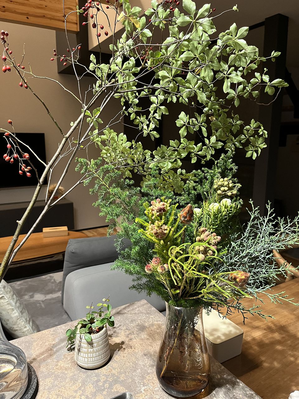 木の実のようなネイティブフラワーを中心に束ねることで、ナチュラルで落ち着いた雰囲気に。