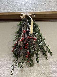 初めてスワッグを作りました。 赤い実がたくさんあって、かわいらしいです。 お花は、とても新鮮でした。