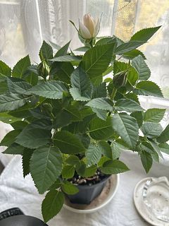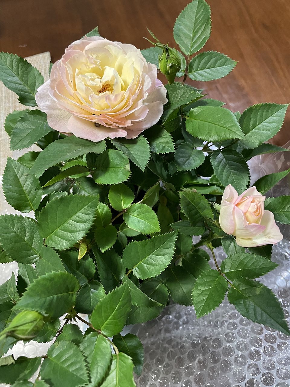 とても元気な葉っぱと可愛らしい色のバラで思わず笑顔になりました。つぼみが開くのも楽しみです。