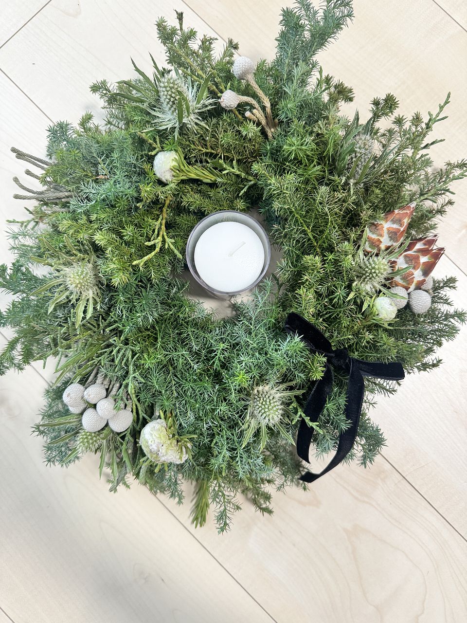 花材の量もアイテムの種類もちょうど良かったです。 グリーン系でまとまる雰囲気が大人っぽく満足ですが リースとして欲しかったのでキャンドル無しバージョンと選べるとなおよかったかな。