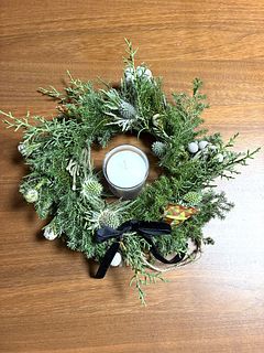 ロウソクはテーブルで楽しむとして、ドアに付けるリースとして工作が好きな小3娘と作りました❤︎約1時間程、あーでもないこーでもないと試行錯誤して、リボンも丁寧に結び取り付けました!着いた当初はリース枠小さい?と思いましたが、葉が盛り沢山入っているのでどんどん大きくなり、結果的に丁度良い大きさになりました。余った葉で小さなキャンドルリースも作れそうです。親子で大満足でした!