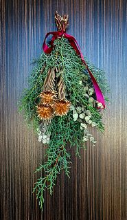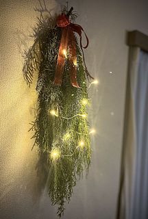 スワッグにして玄関に飾りました。とにかく香りがいい!玄関に入った途端、爽やかに香ってくれます。ボリュームがあり、リボンで結んで飾りを付けただけです。センスのない私でも素敵になりました(写真ではあまり伝わらないかも)。クリスマスが終わったらサンタさんを違ったマスコットに替えて、長く飾りたいと思っています。