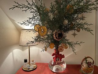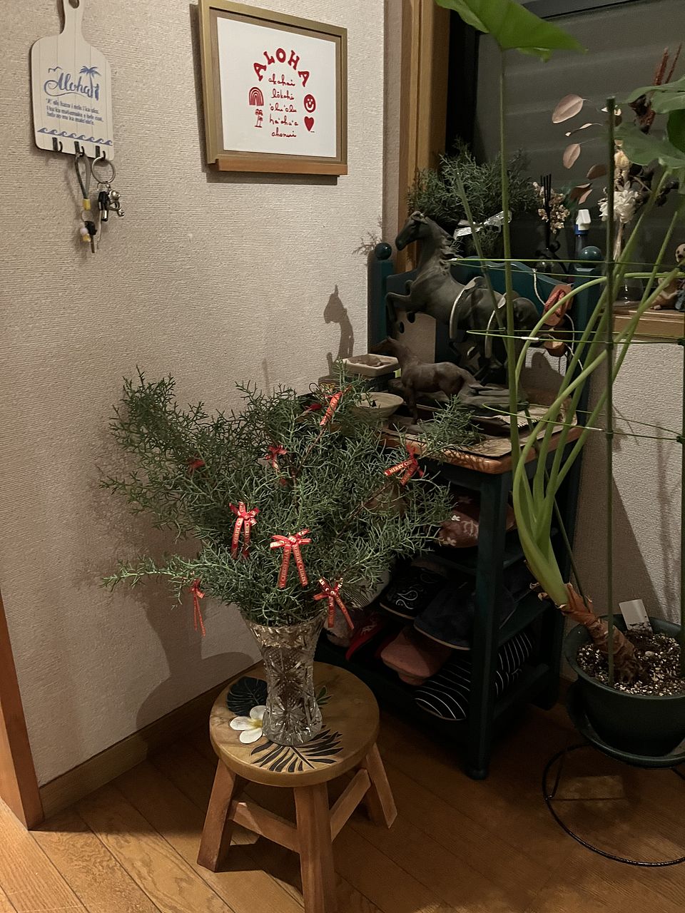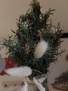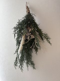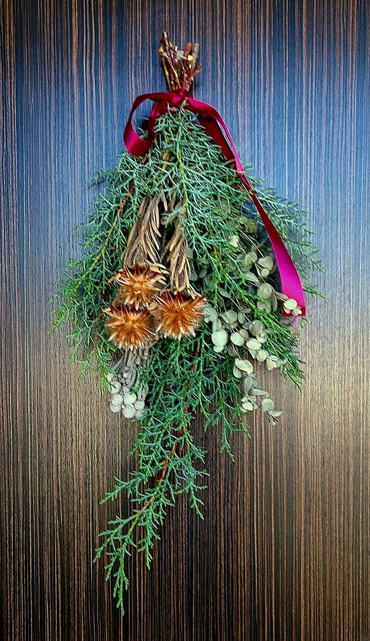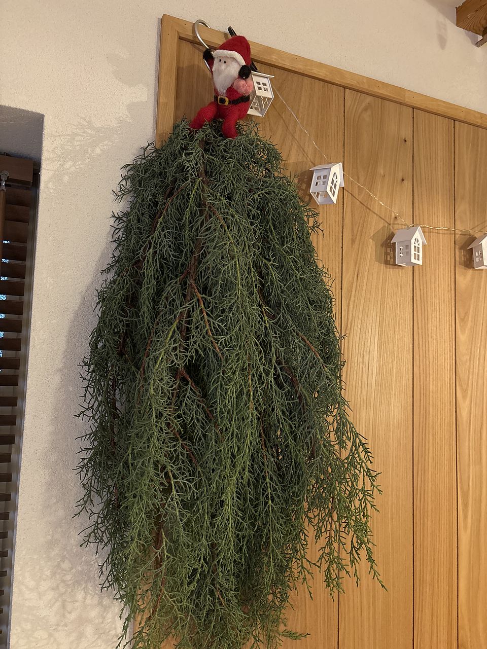 早速スワッグ初挑戦。香りがよくボリュームもあり もともと飾っていたホワイト系のドライフラワーを混合して可愛いものが出来上がりました。ミニツリーも作り満足🌲 部屋の中にグリーンがあってとても浄化されます。