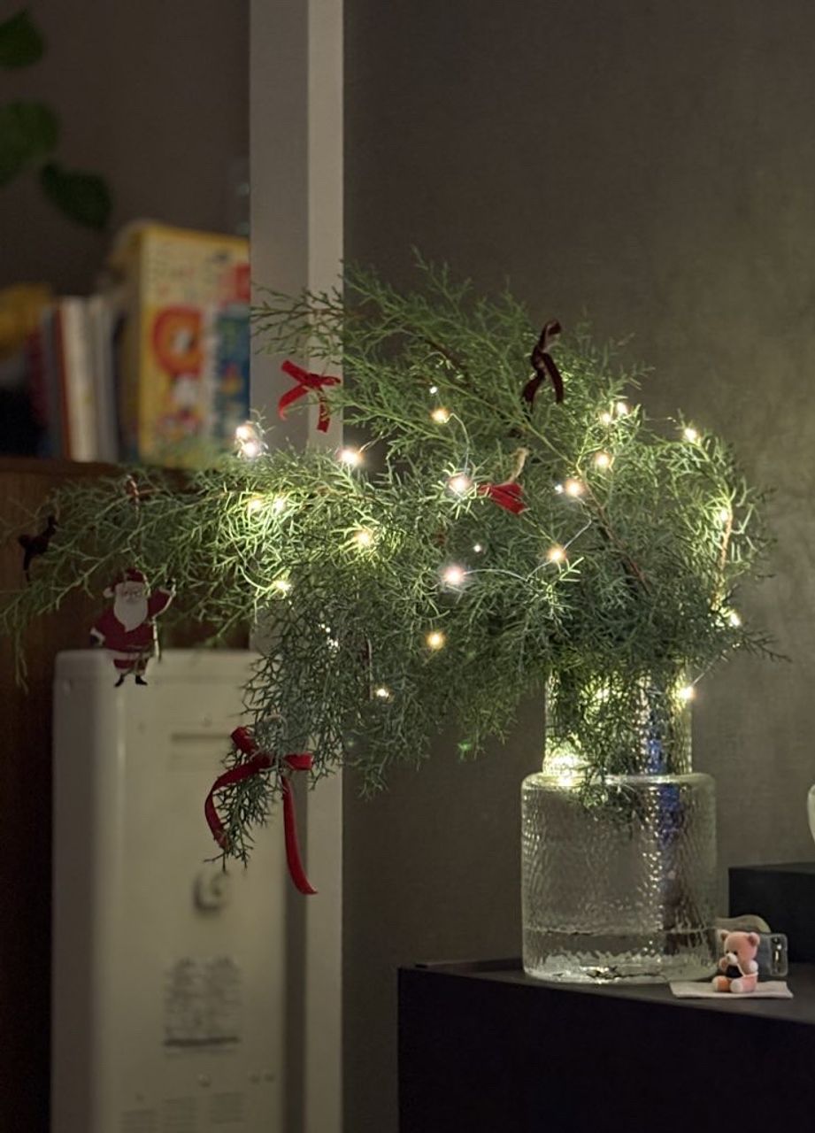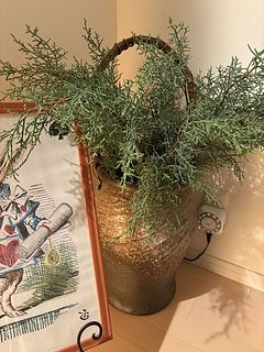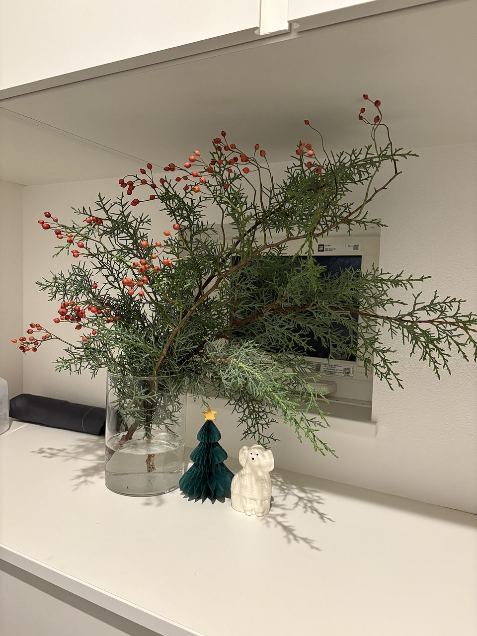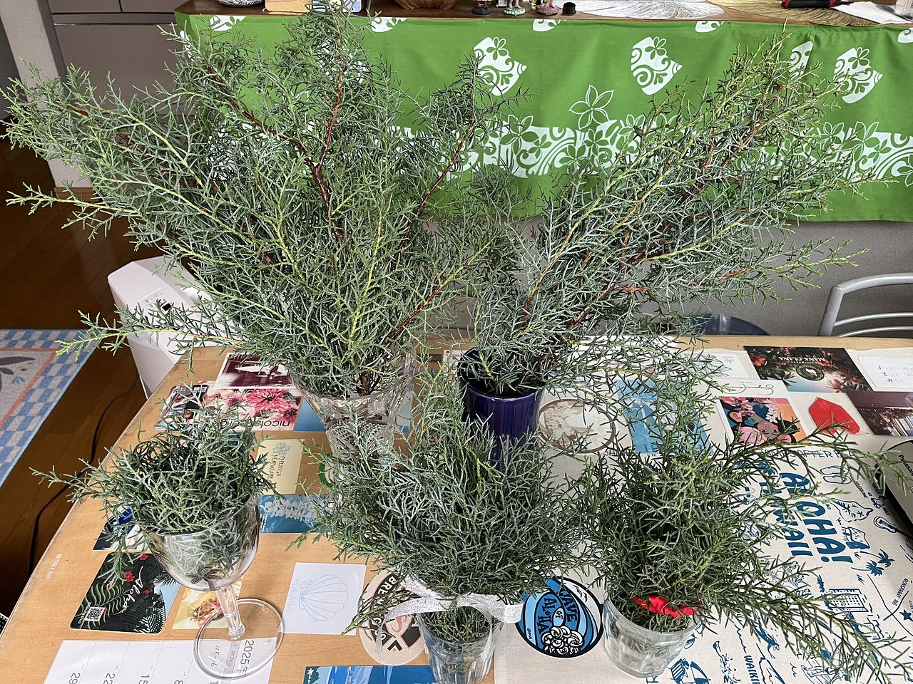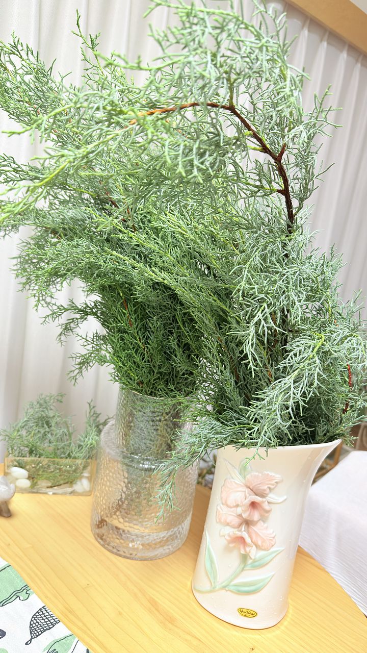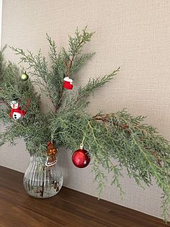 ボリュームたっぷり! 森の香りに癒されながら、スワッグやツリー、苔玉みたいになったけどオーナメントを作りました。 切り落とした枝も たくさんあるので、花瓶にさして寝室や玄関に置いています。 大満足です♪