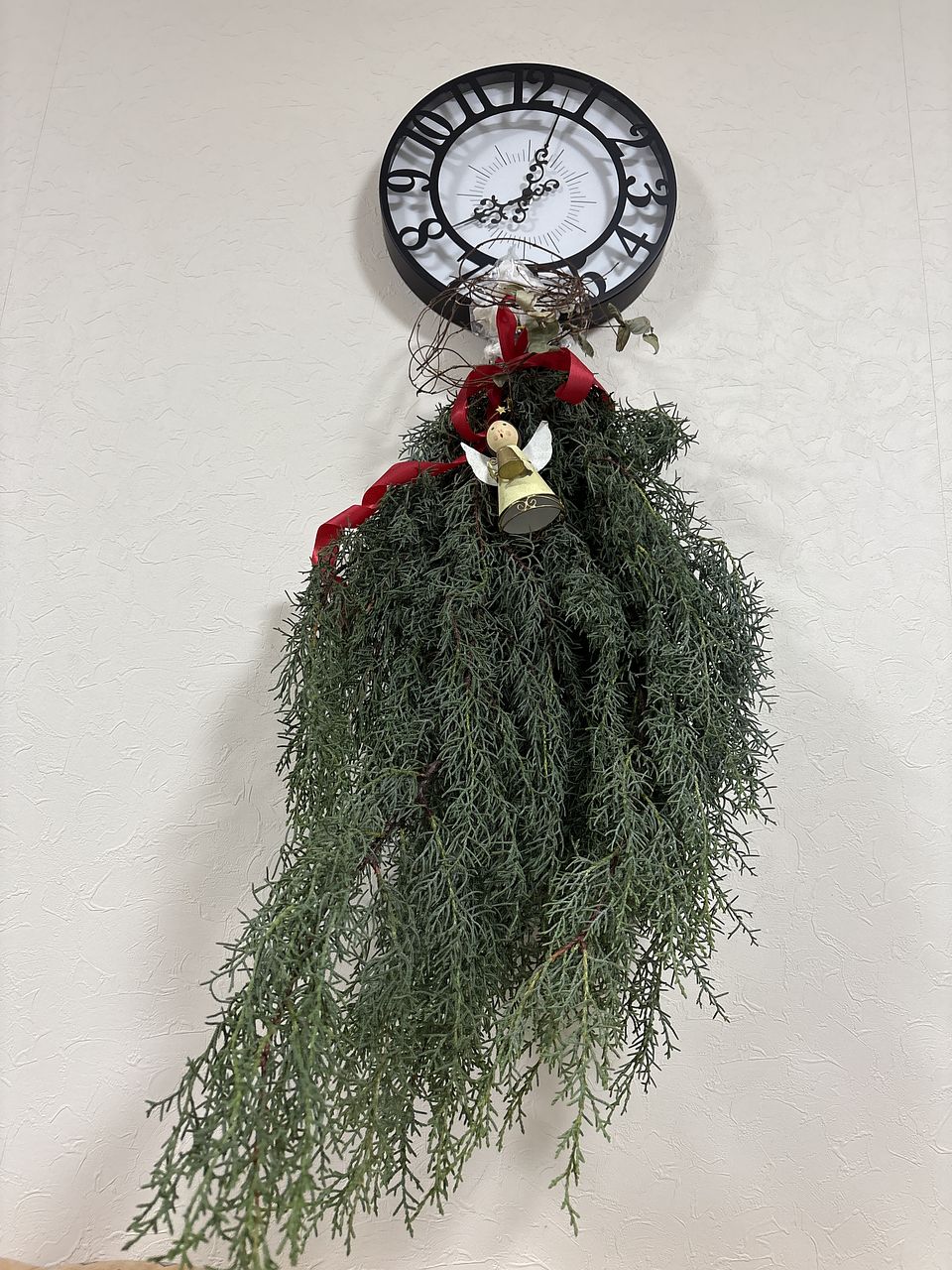 ボリュームのあるスワッグ、ツリーを作り、ツリーの根本をチョキチョキした小さな枝を組み合わせたリースを作りました!合計3点。かなりのボリュームでした。 リースは枠やワイヤーを使えばまん丸になったと思いますが、楕円でも愛嬌があってかわいい。 枝が立派なだけあって重量があるので、スワッグを玄関先に飾るのに苦戦しています。笑