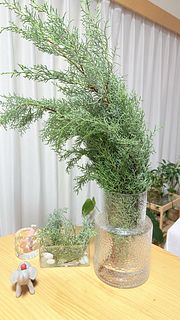 色、ボリューム、思ったとおり💕 香りが想像以上に素敵でした。 ひとつにまとめて飾りたかったけど、対応できる花器がなく、2つに分けましたが玄関、リビングで森林浴中にちらーっとハッカのような爽やかな香りを感じて満足です。 沢山落とした小枝も可愛いからリボンでくくってあちこちにディスプレイしてます。
