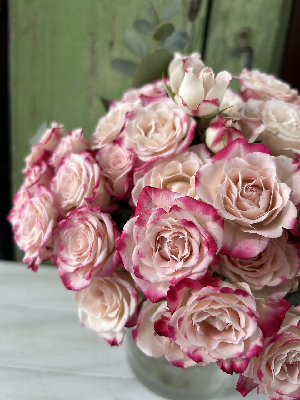 花びらの外側に濃いピンクが入る、まるでイチゴとミルクの混ざったような🍓甘いストロベリーミルクを思わせるバラ「リフレックス」。可愛らしさ抜群の姿は見ているだけでほっと優しい気分に。スプレーバラはラフにいけてもさまのなるのが嬉しいポイント。ぜひお試しを。