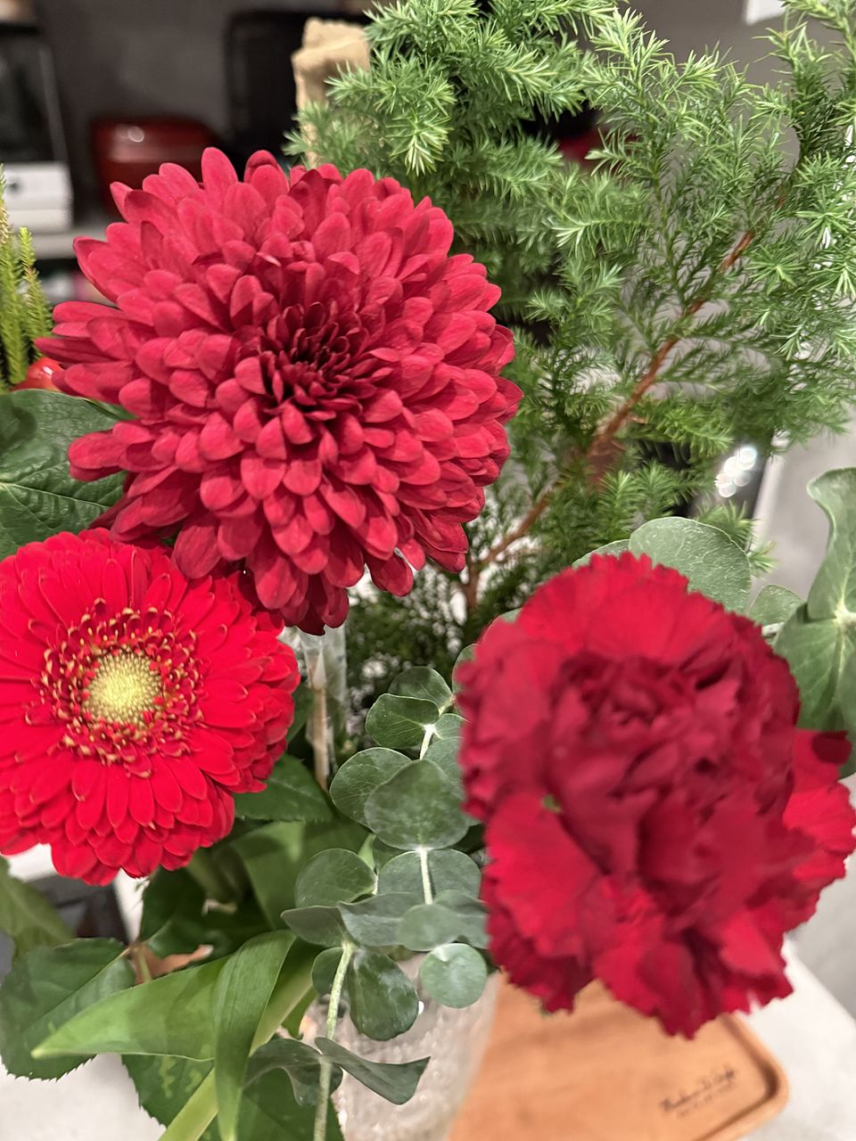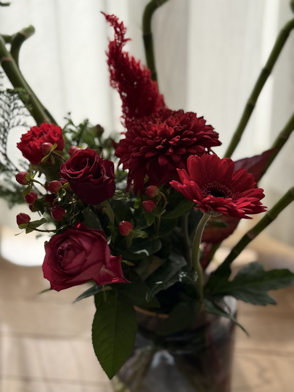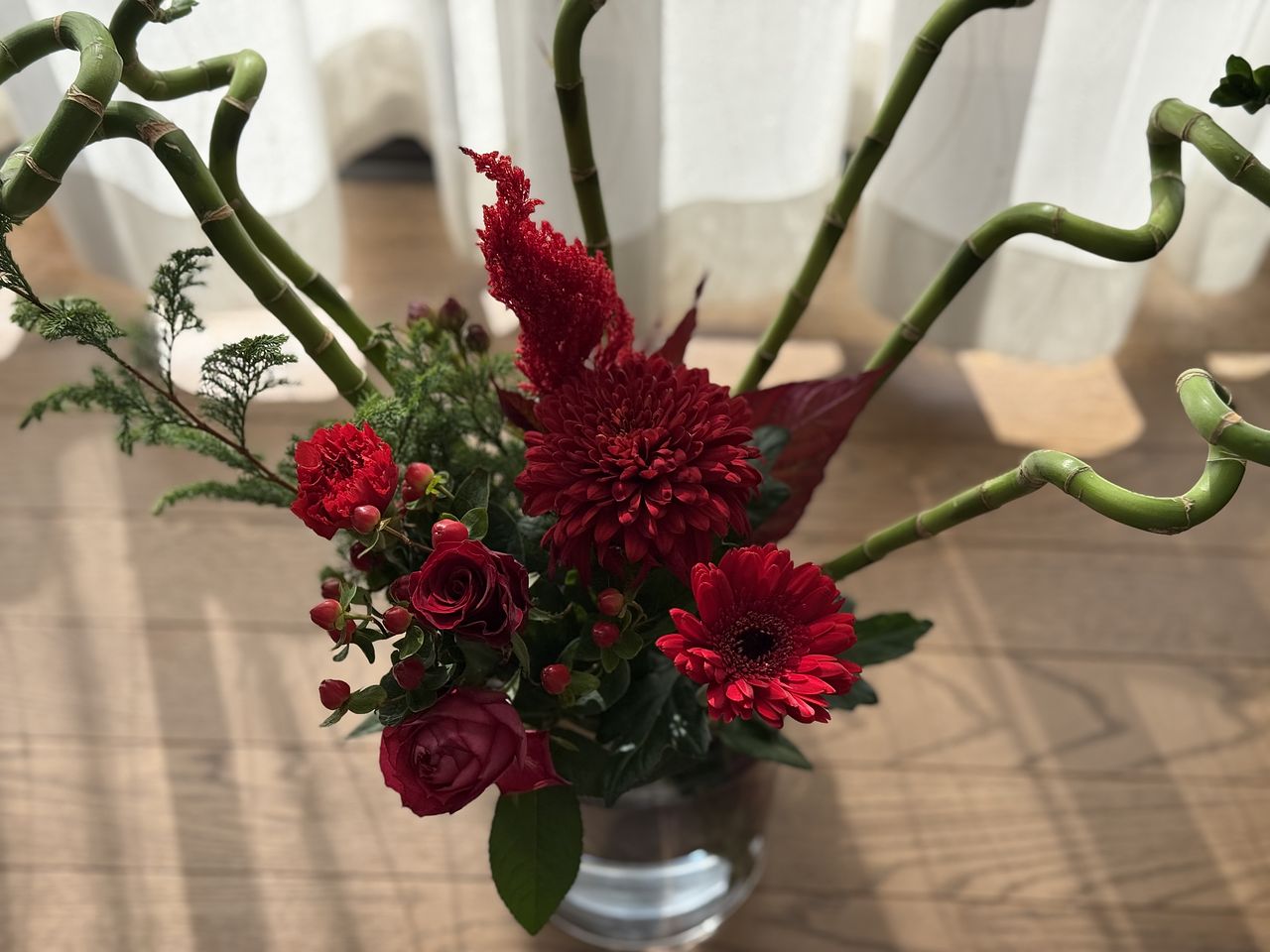 結婚記念日に購入しました。後ろのスパイラルバンブーは10月に購入したものです。意外とあっていませんか?期待通りのブーケで赤がすごく綺麗です。 見るたびに嬉しい気持ちになります。