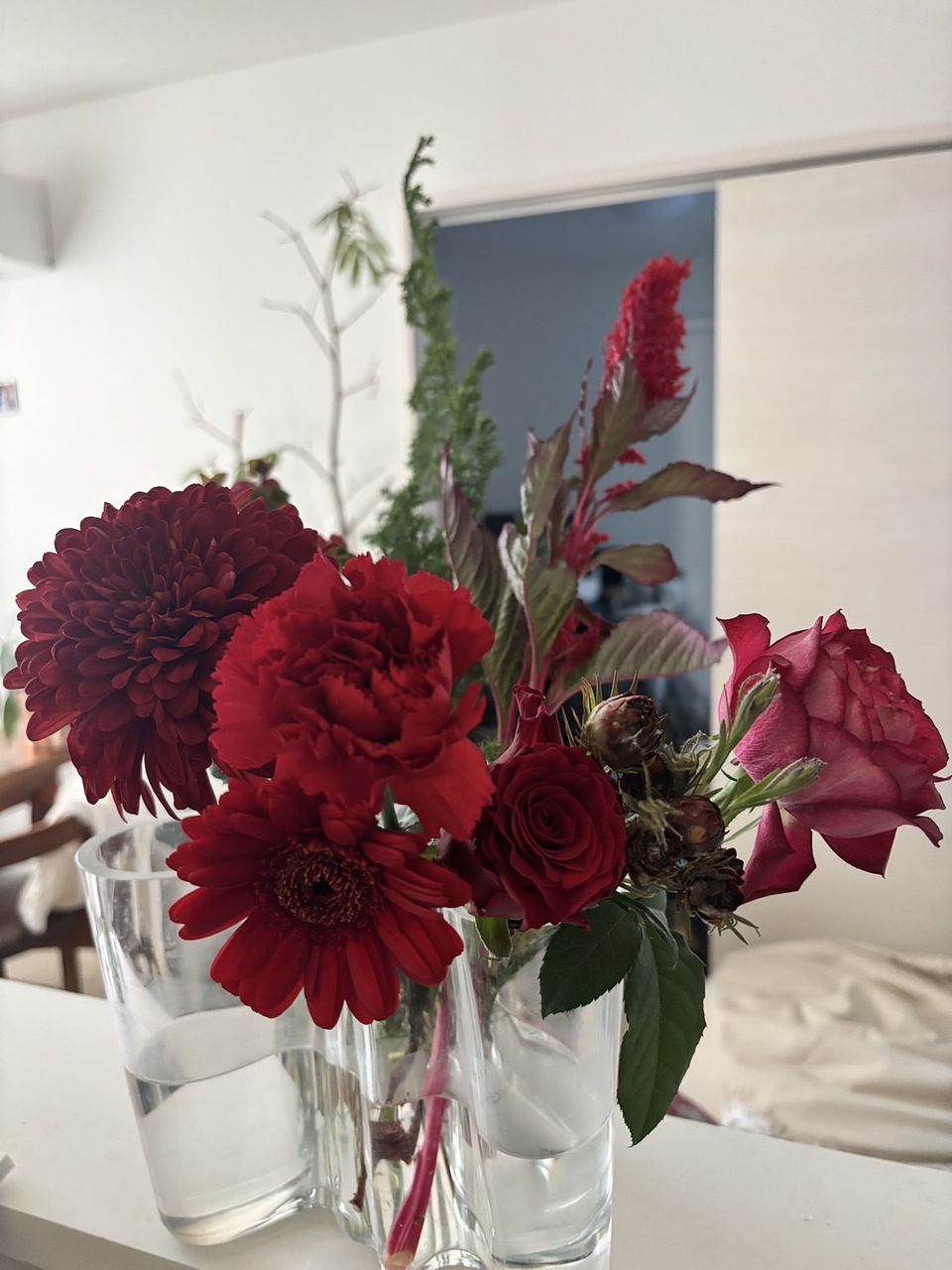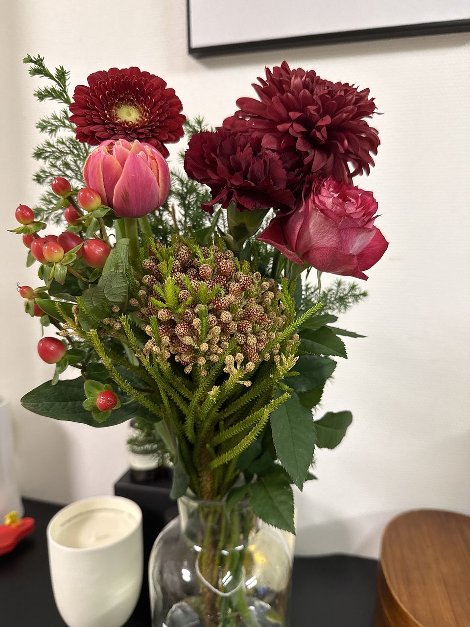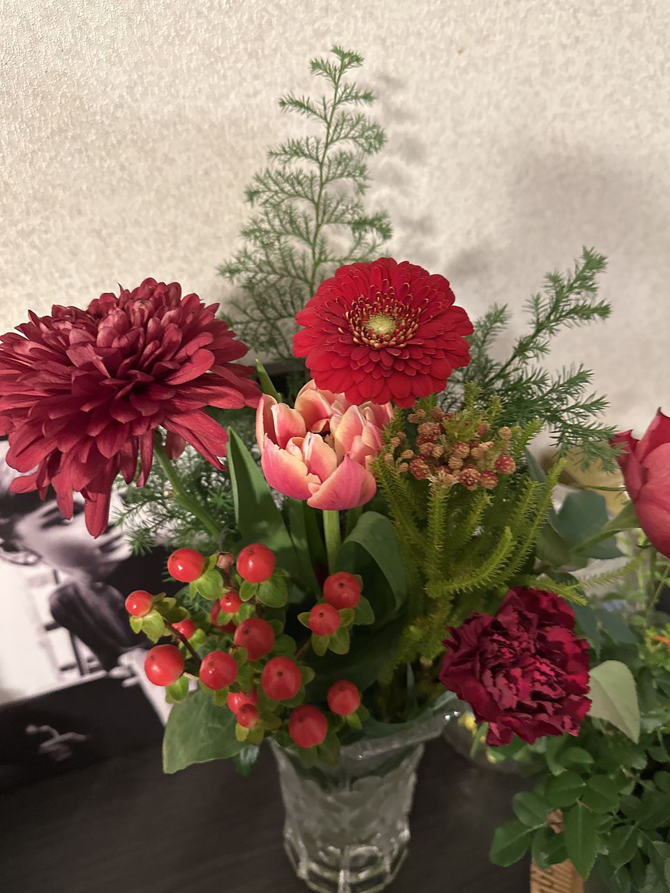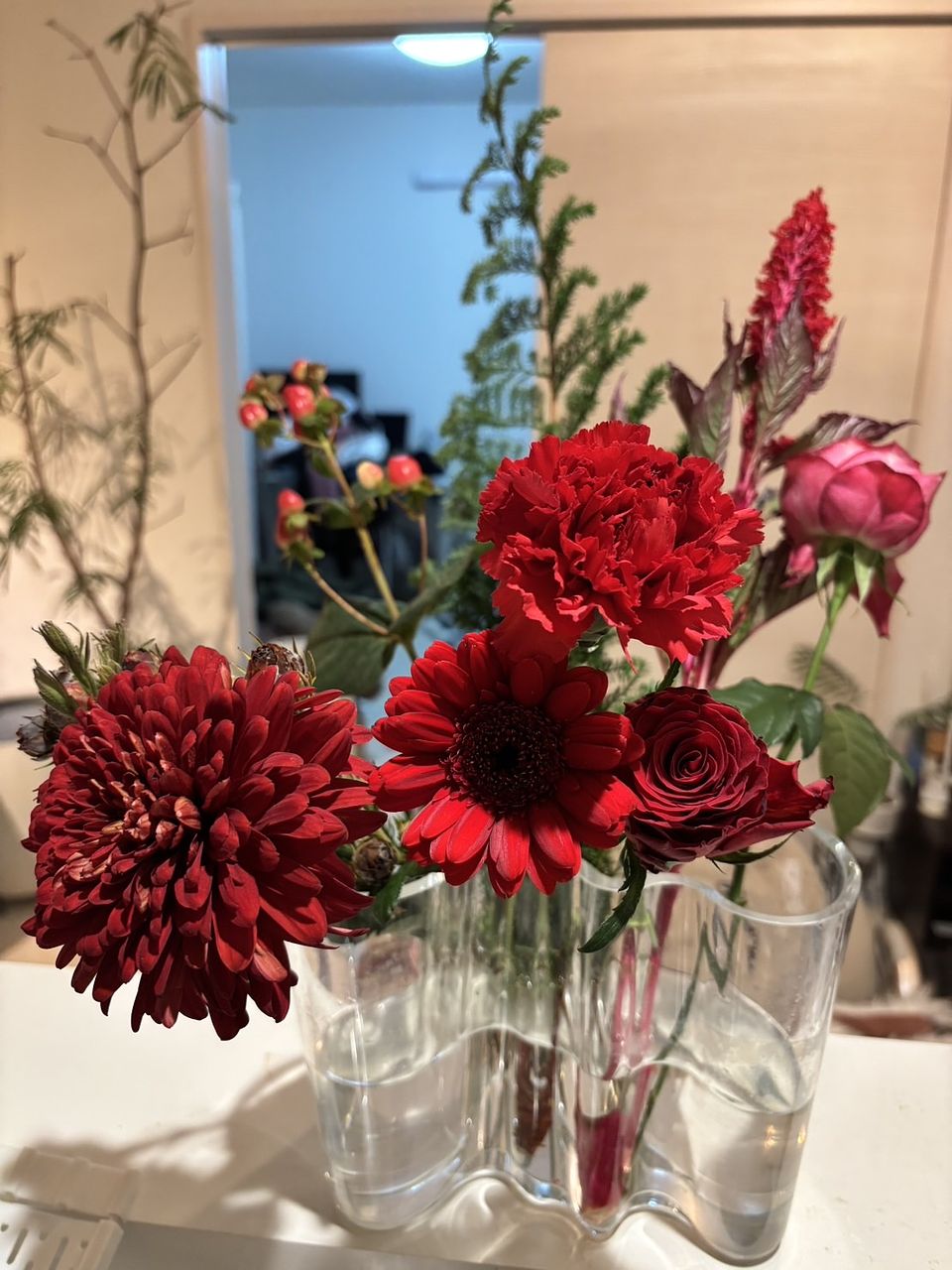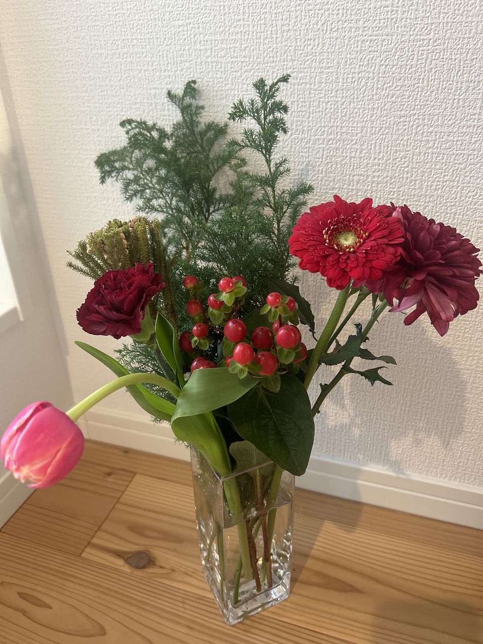 いろんな赤のお花が届きました♪ ミニチューリップは花弁が多く、部屋に置くとどんどん咲き始めて可愛いです🩷 バラとガーベラの色も素敵ですし、ヒペリカムの赤い身がアクセントになり気に入っています。 ありがとうございました!