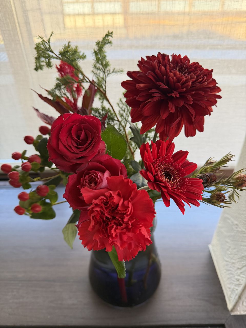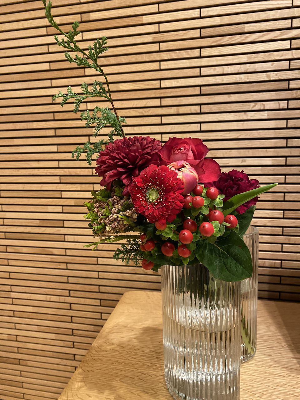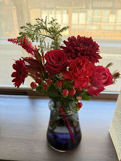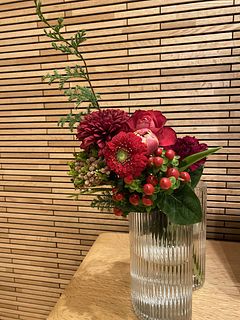 年末にふさわしい深くて落ち着いた赤のブーケでした。