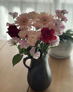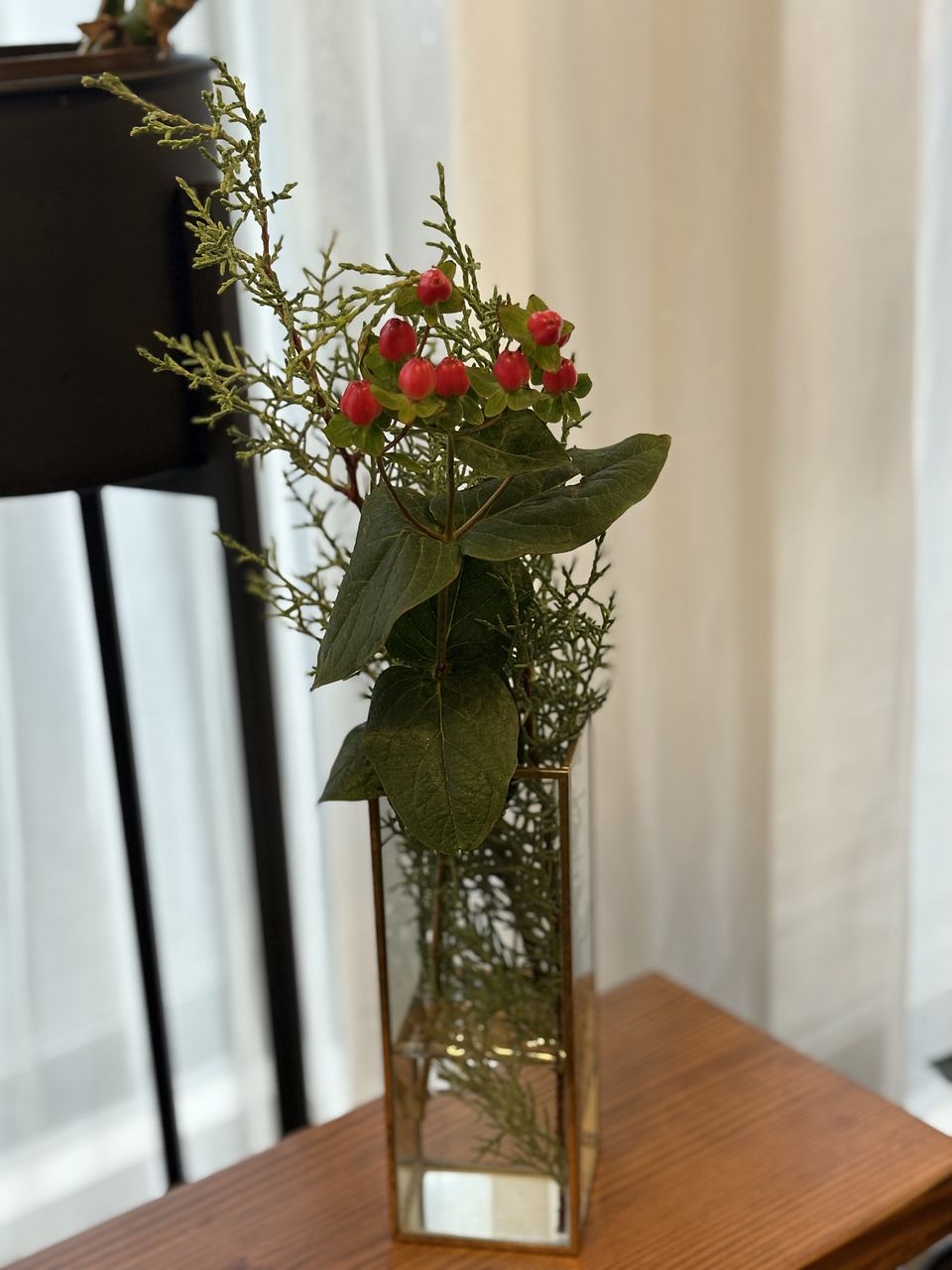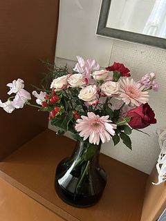 残り1個の時に購入できました バイカラーのピンクと赤い縁のバラに大好きなヒペリカムなどの赤もあり、香りも楽しめました 思った以上に良かったです