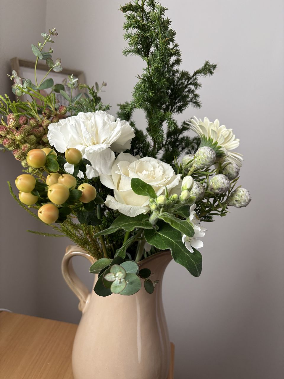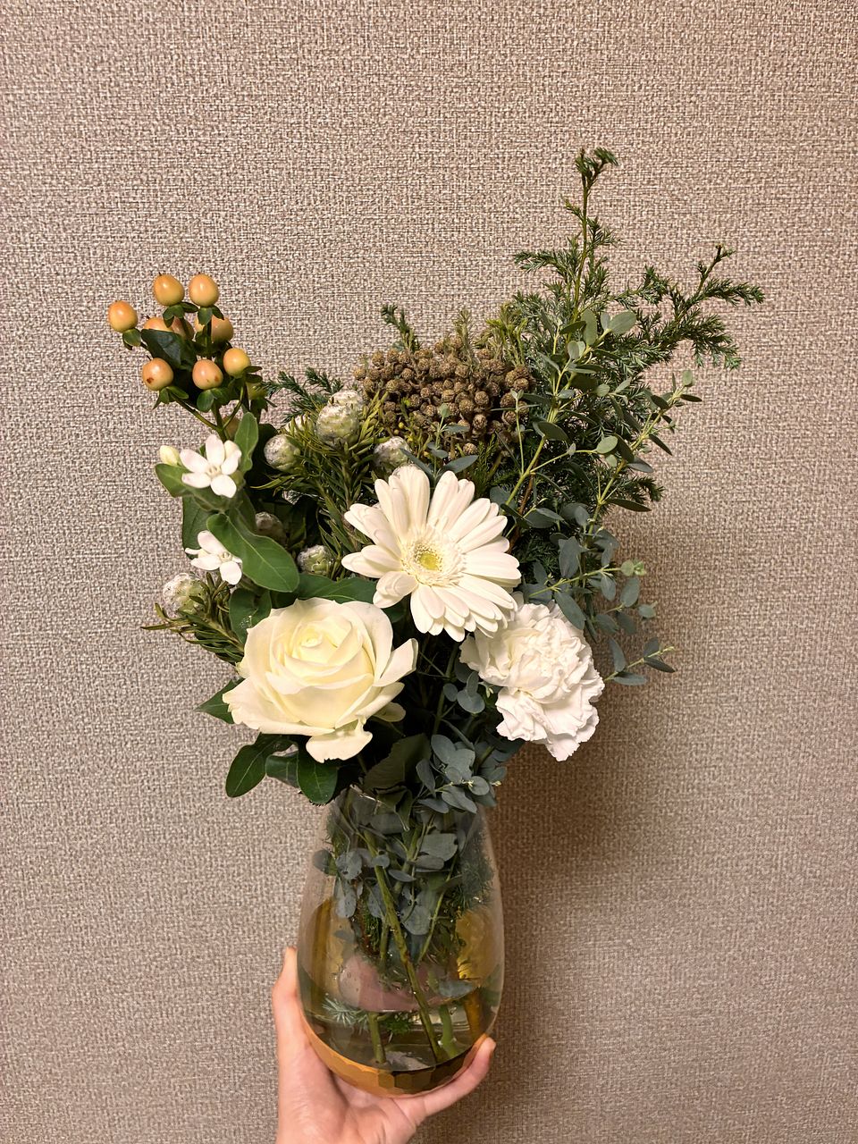 ホワイトメインにクリスマスらしさもあって可愛い🤍ボリュームも満点でIKEAのビンに入れてみました!初めて頼んだのですが切り花用のフラワーフードも入っていて大満足です!欲を言えば、届いた時に花が満開だったのでもう少し開きが控えめだとより楽しめたかなと思います🙋♀️