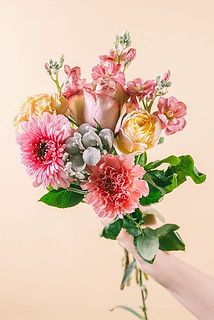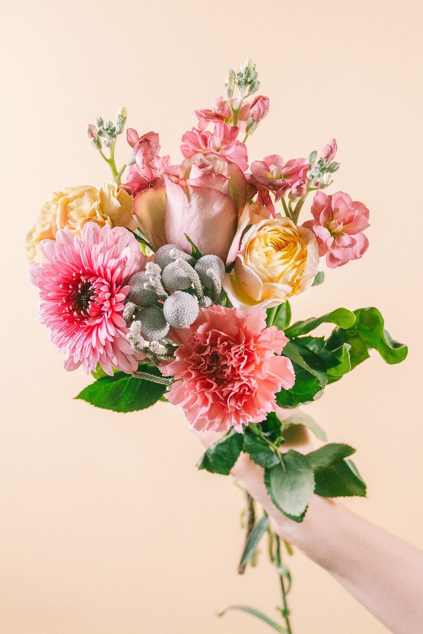 ピーチカラー、クリーム、ビビットピンクを重ねた、デザートみたいにかわいいブーケ🍑🧁ガーベラ、カーネーション、チューリップ、ストックなど色鮮やかなカラーをミックスして今っぽい軽やかさをプラスしています。