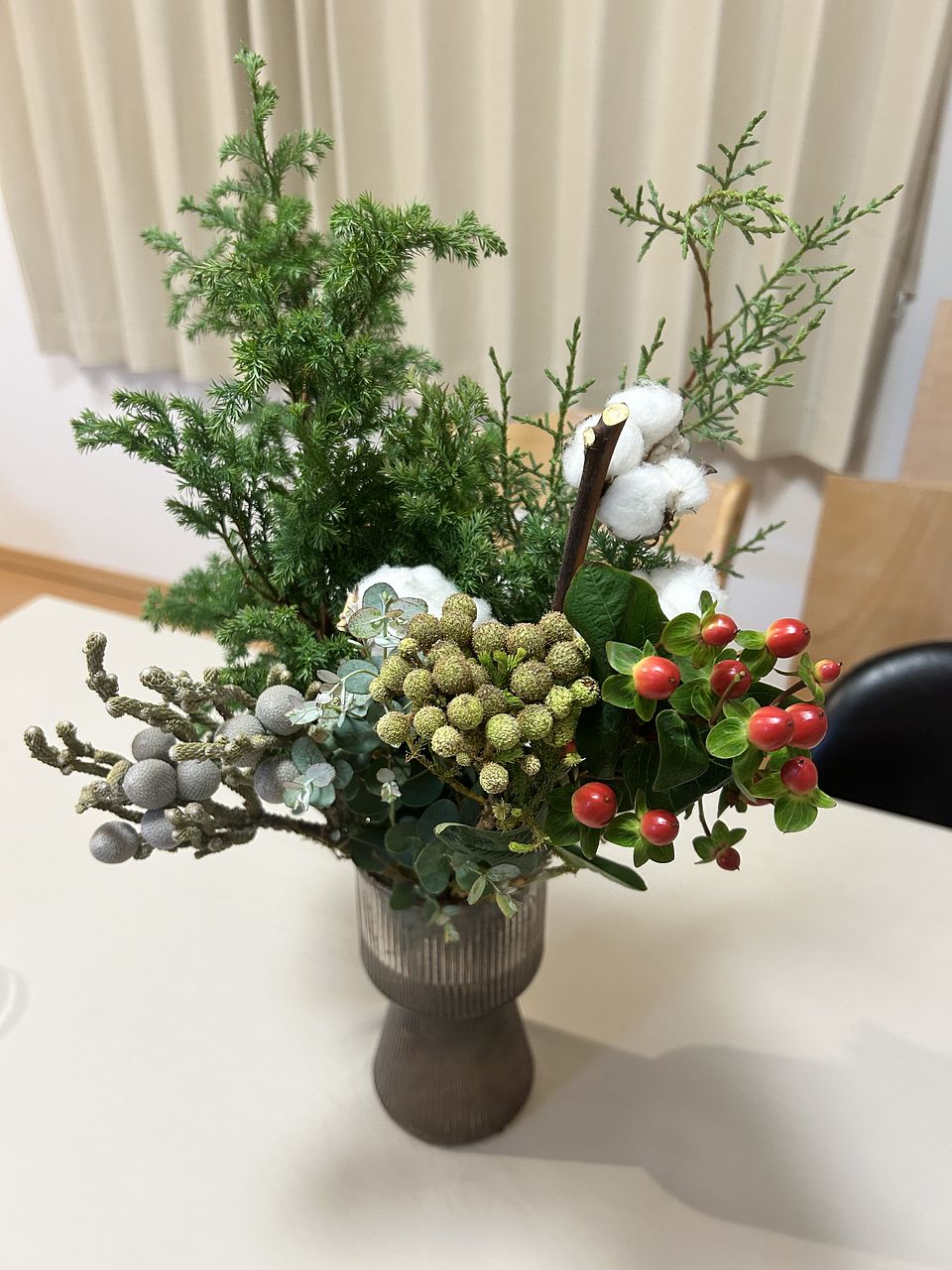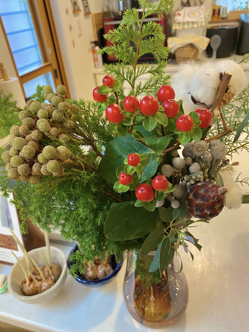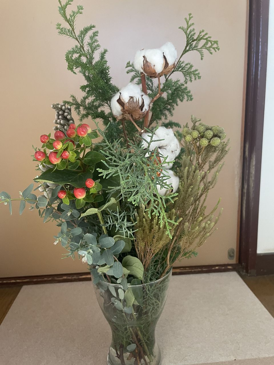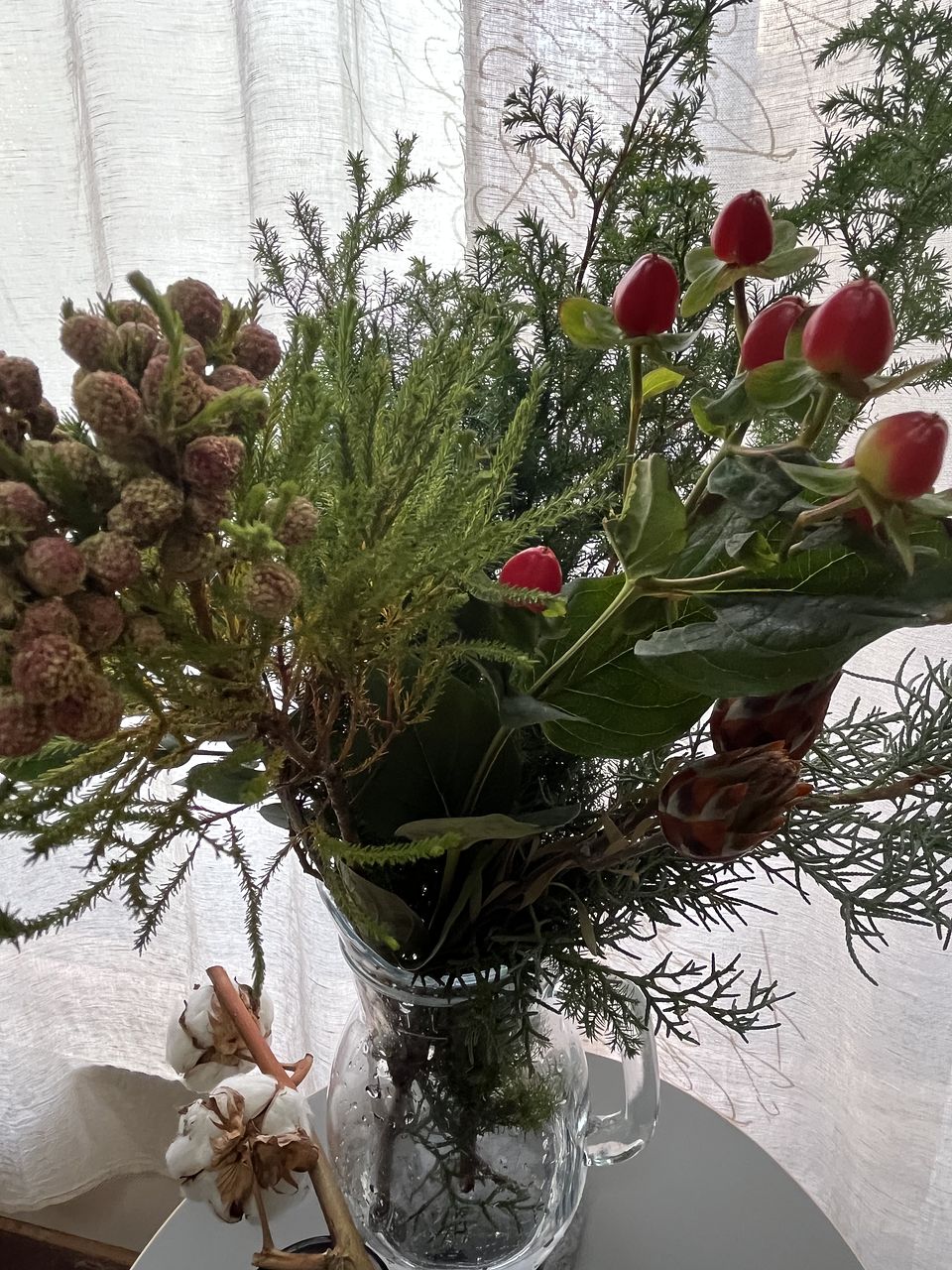 ヒペリカムを少し足してスワッグにしました。ボリュームあってとてもよかったです!カットした枝やコットンは花瓶に入れて飾ってます。