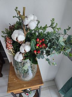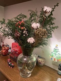 クリスマスを感じさせるステキな商品でした。 ヒバのフレッシュな香りがここち良いです。 ただ、綿の木が1本、フレッシュな商品と別に入っていたので上手に配置できず、水換えのたびに定位置をさがしています 笑