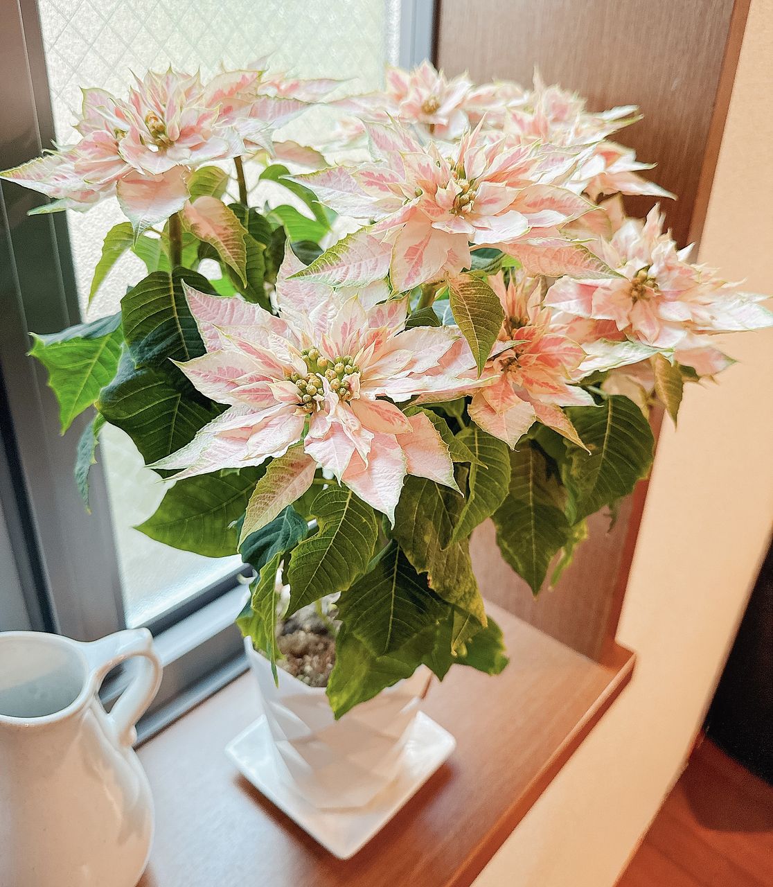 淡いピンクがラブリーすぎる🎀クリスマスの定番プリンセチア「ロゼマーブル」が入荷しました👸🎄華やかな八重咲きとマーブルカラーがとても可愛く、お部屋のアクセントになるはず👀