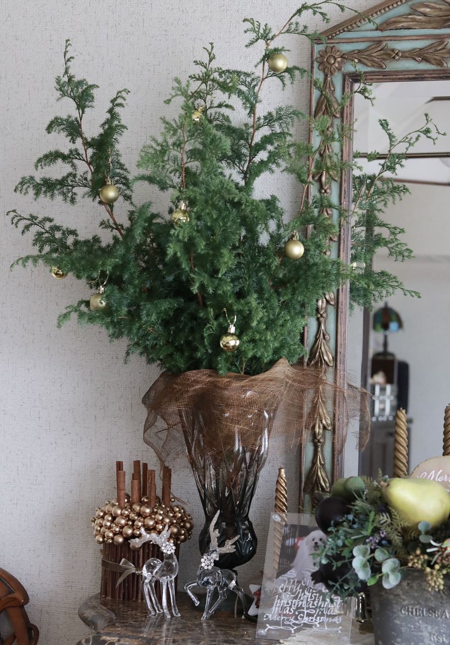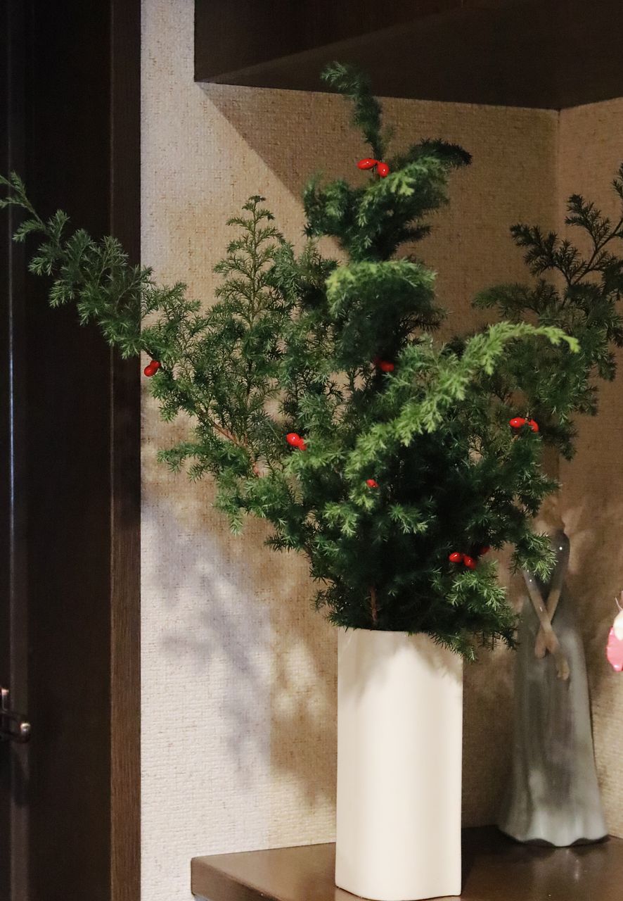 オーナメントもつけて、玄関がとても華やかです…! フルのクリスマスツリーは大変でも、花瓶に飾れるクリスマスツリーで一気にクリスマス感増しました🎄