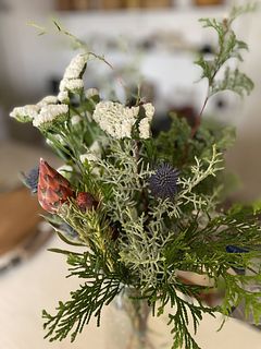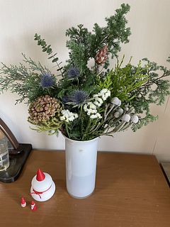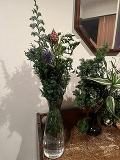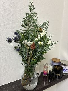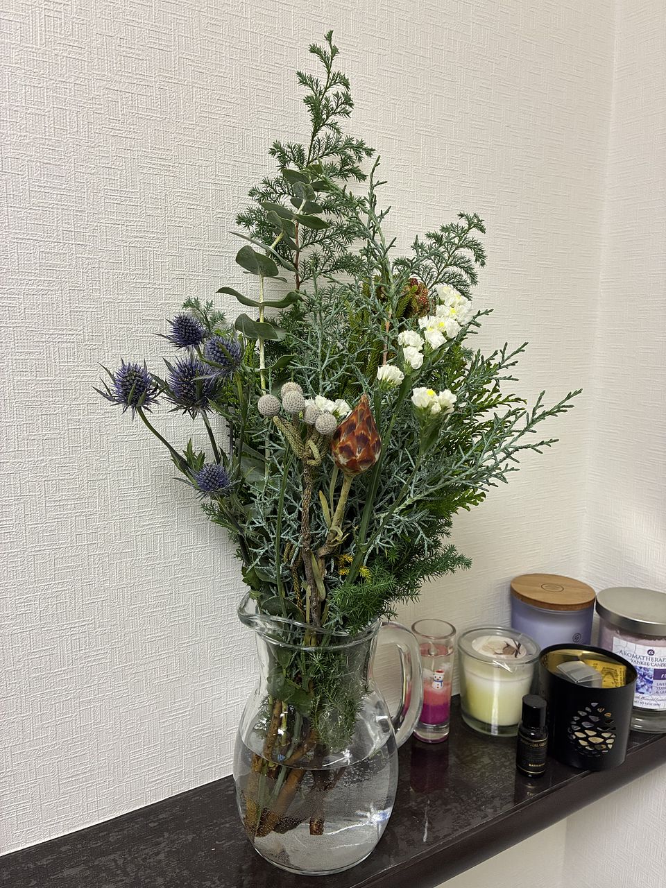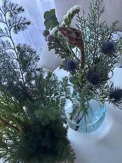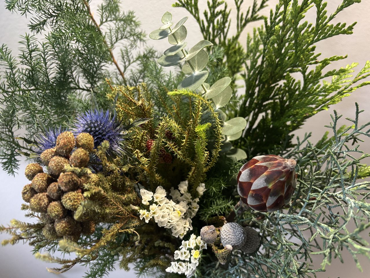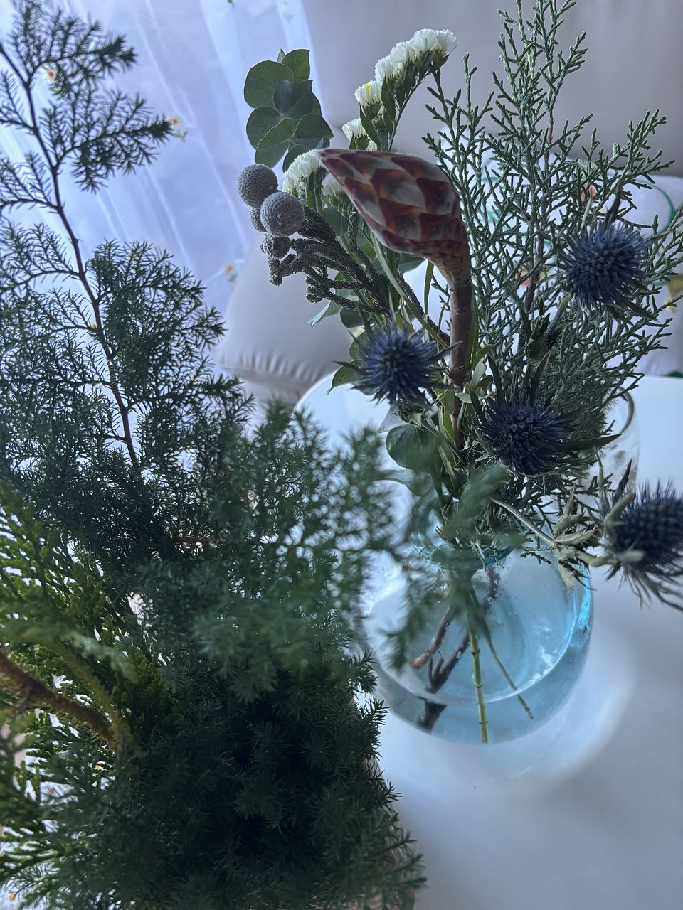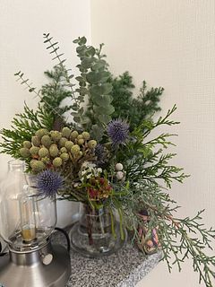 届いたお花がとても素敵で感動しました。 グリーンのボリュームがしっかりあり、ユーカリやヒバの爽やかな香りがふわっと広がります。 アクセントになっているブルー系のエリンジウムや、個性的な実ものも綺麗な状態で届き、写真以上におしゃれな雰囲気でした。 全体のバランスも良く、そのままでも素敵ですが、今後お花を追加してアレンジを楽しむのも良さそうです。