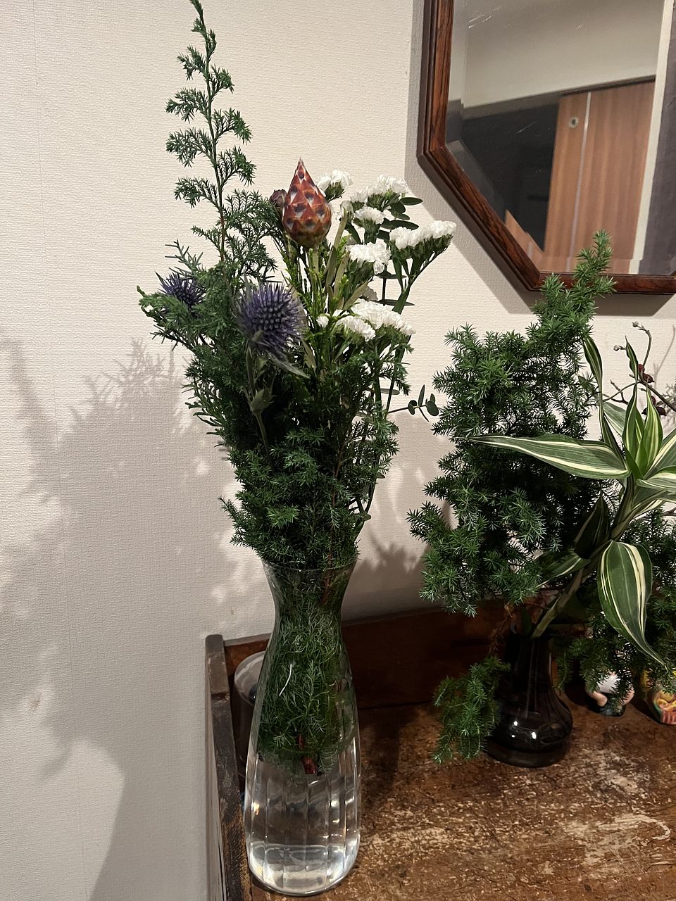 花がスターチスの白だけで全体的に地味で残念🥲 ユーカリも入ってなかった😅 仕方ないですね、、エリンジュームの葉が枯れていました。後のは新鮮でした