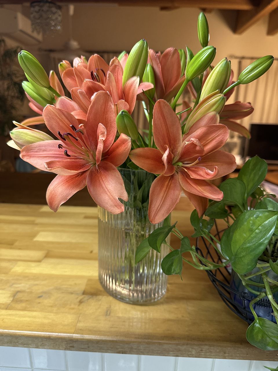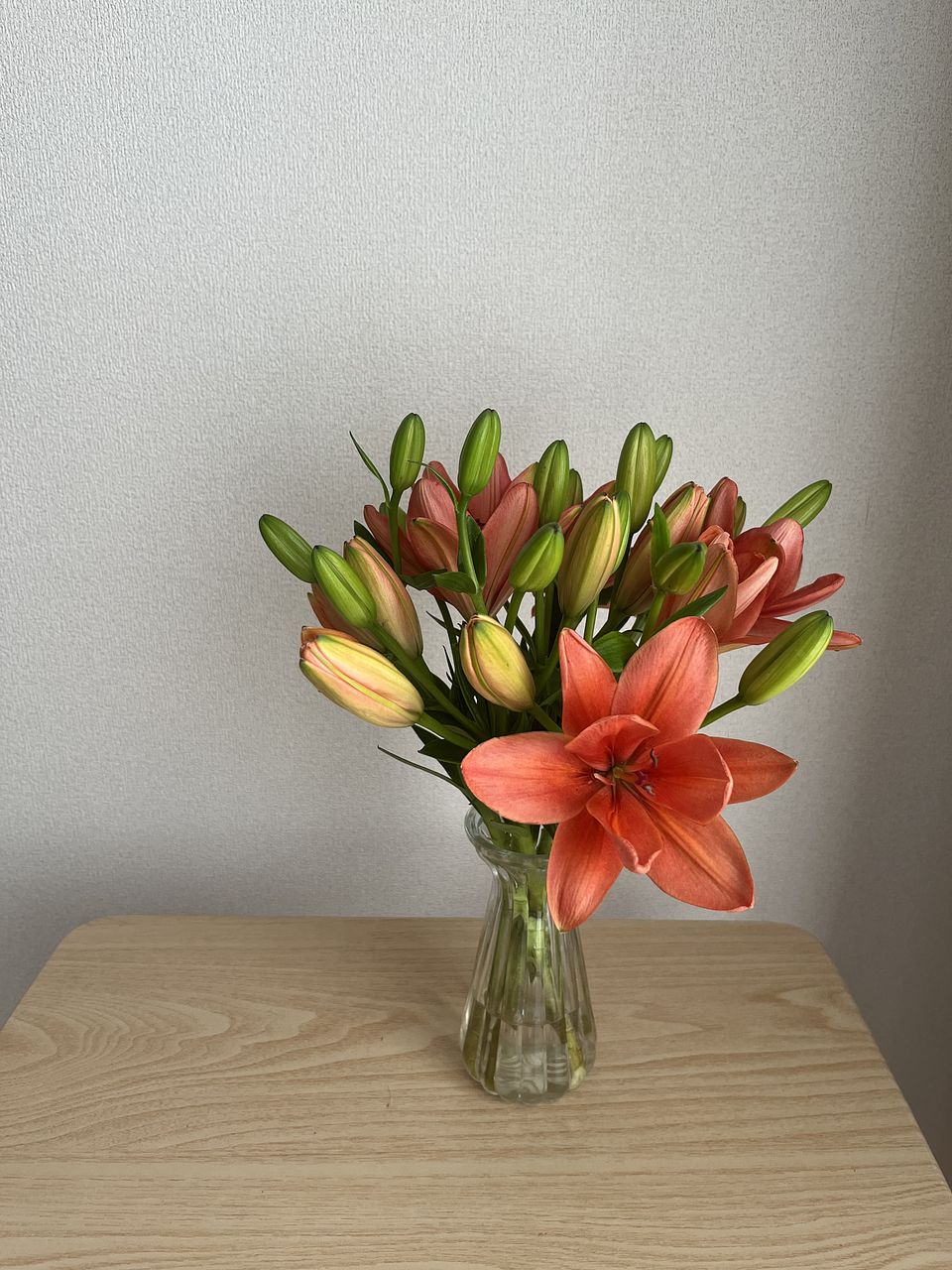 見た目的にはそこまで好みではないかなと思いつつ、4ー5日留守をするので持ちの良いユリにしてみました。帰ったら全く、枯れてもなくそのまま咲いていてとても嬉しかったです♪