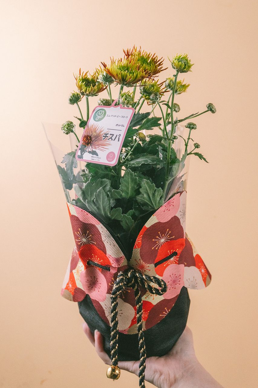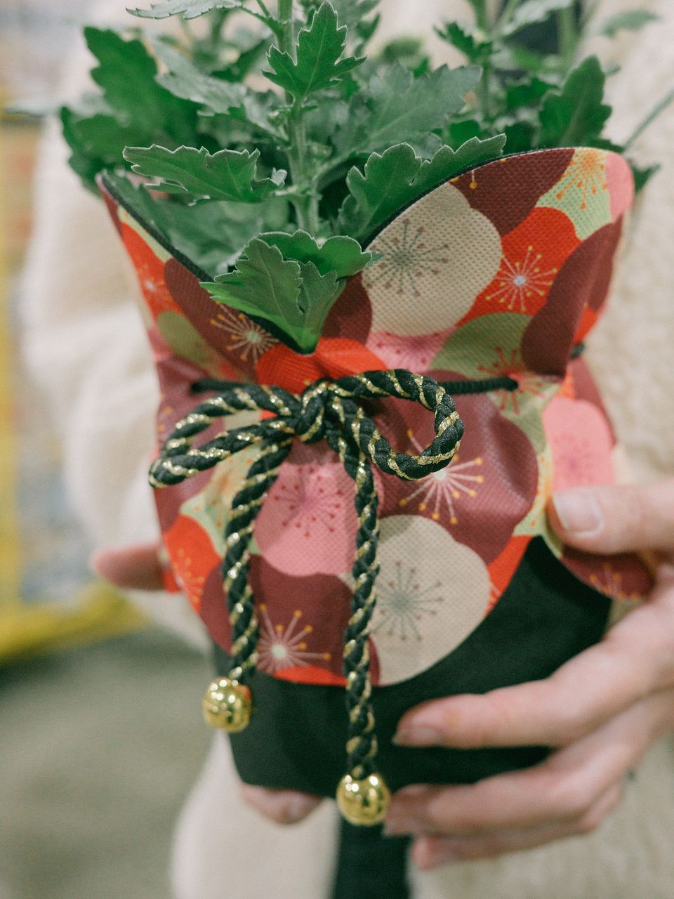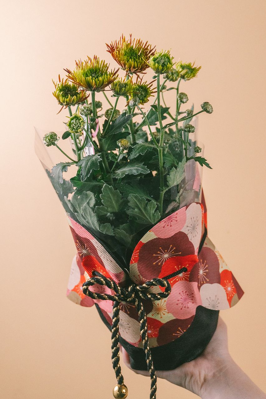巾着仕立てのマムをそっとお部屋に飾るだけで、空間が一気に華やぎ、季節感あふれる迎春インテリアに🎍