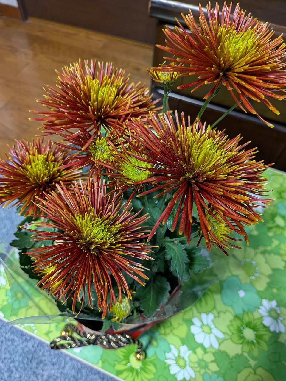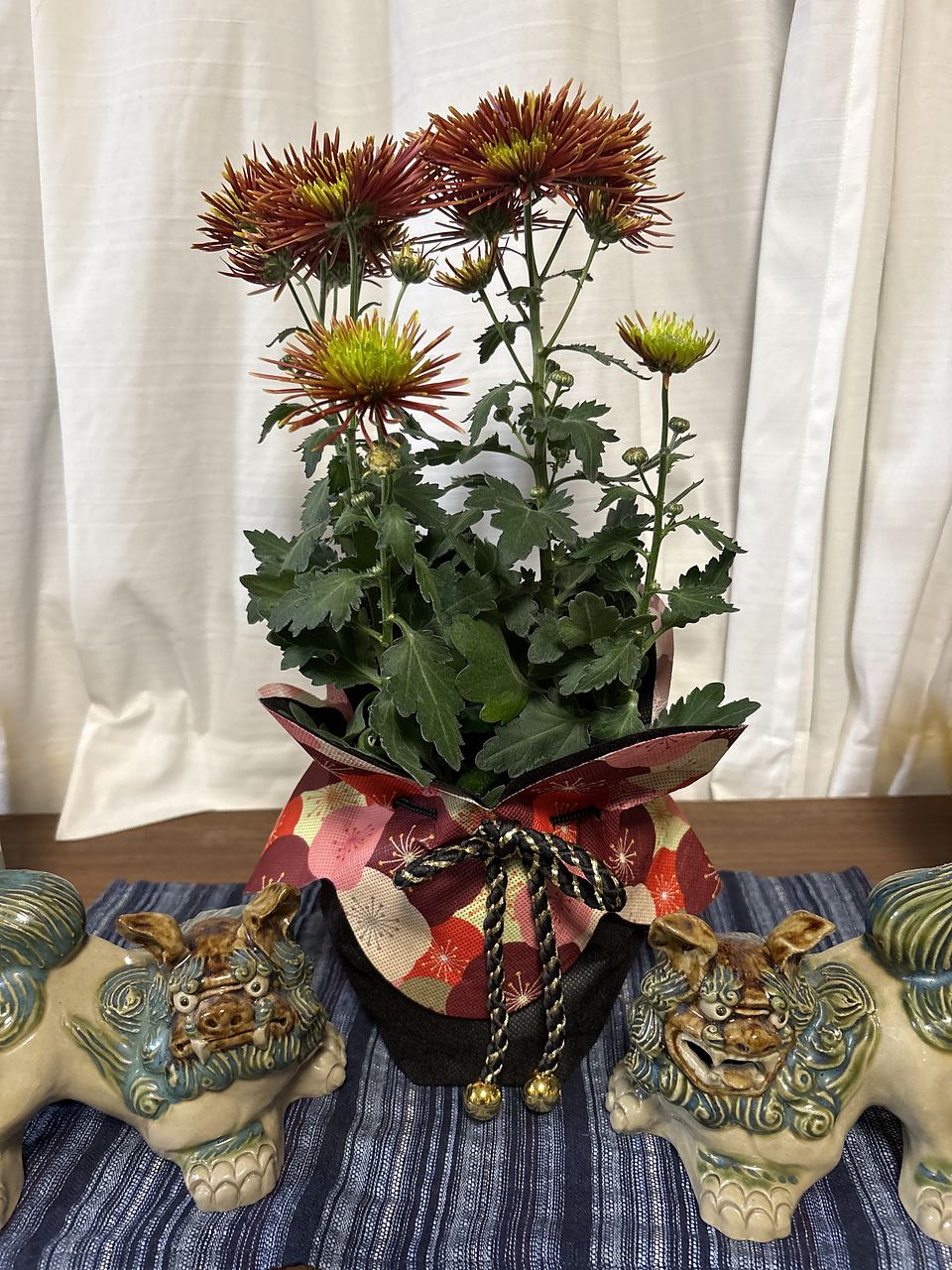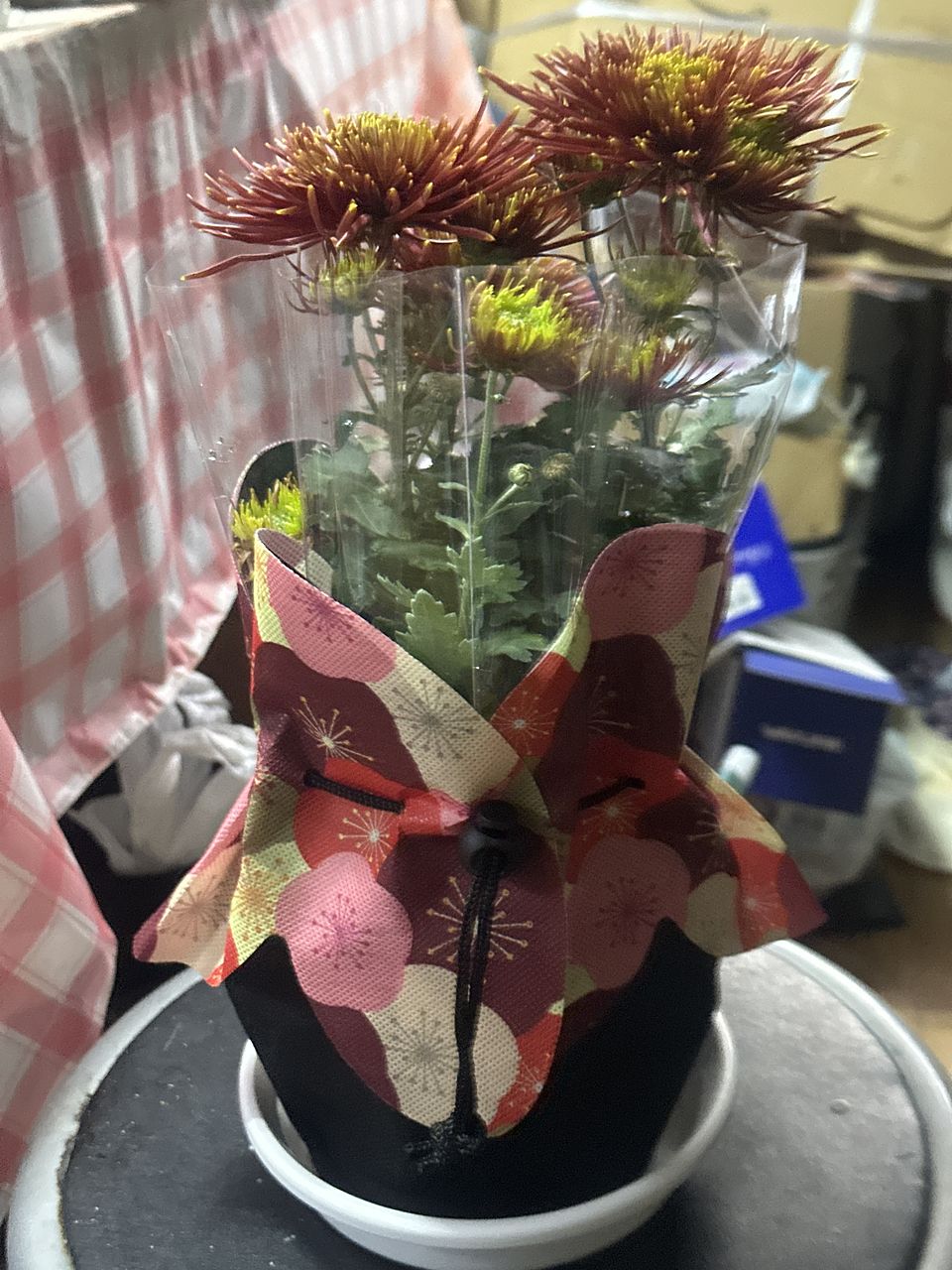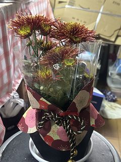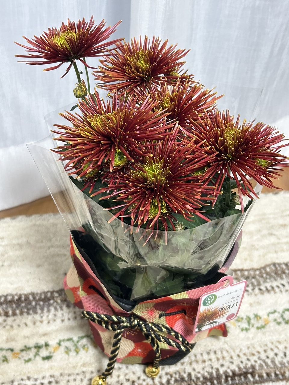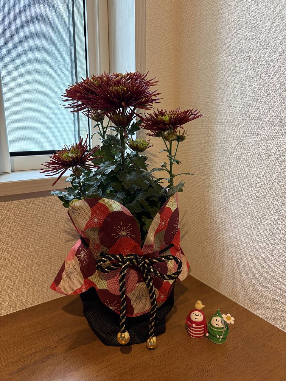 見た目は良いのですが、水やりなどのケアをするのには一度かぶり物を外してからで無ければ布がグチャグチャになってしまいます。あと10日で年明けですので今届いてくたびれているとこを元気づけるために水やりと液体肥料をあげましたが。かぶり物を上手く戻せるか暫くしたらやってみます。お水をあげて下から排水したのを確認後になりますが。お水をあげるときは裸にした状態でなければ出来ないので台所なりお風呂場なりでの作業になりますが、キチンとお着物を着せてあげれば今の時期から可愛くて丁度飾るのに映えるお花だと思います。手間のかからないお花はありませんので十分満足しています。こういう企画を今後も続けて頂ければと思います