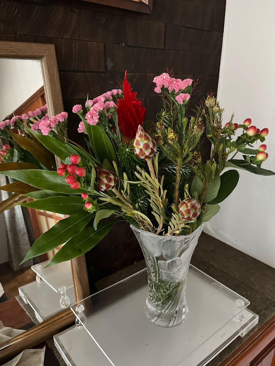 冬の森を元気に駆ける「トナカイ」をイメージしたスワッグ🦌🌲ふわりと伸びるグリーンの葉や、赤く可愛い実物、アクセントになるケイトウがトナカイのツノや鼻を思わせます。優しいオレンジやゴールドの花と葉が色合いを添え、見ているだけで心が温かくなる冬のナチュラルブーケです。