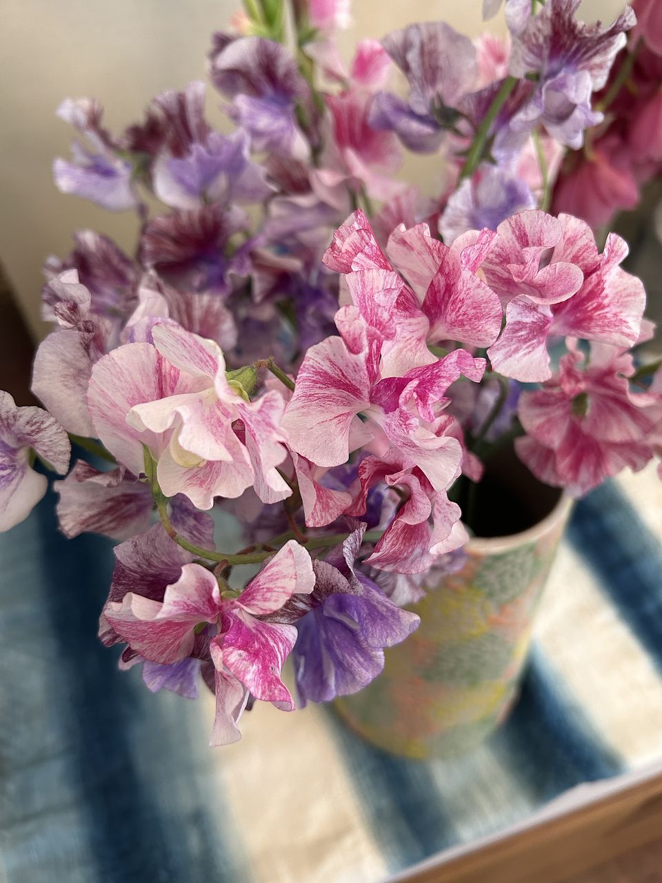とにかく 今まで見たことのない色柄のスイトピーでした。色々あるんですねー ピンクや紫が可愛らしくて 華やかです。