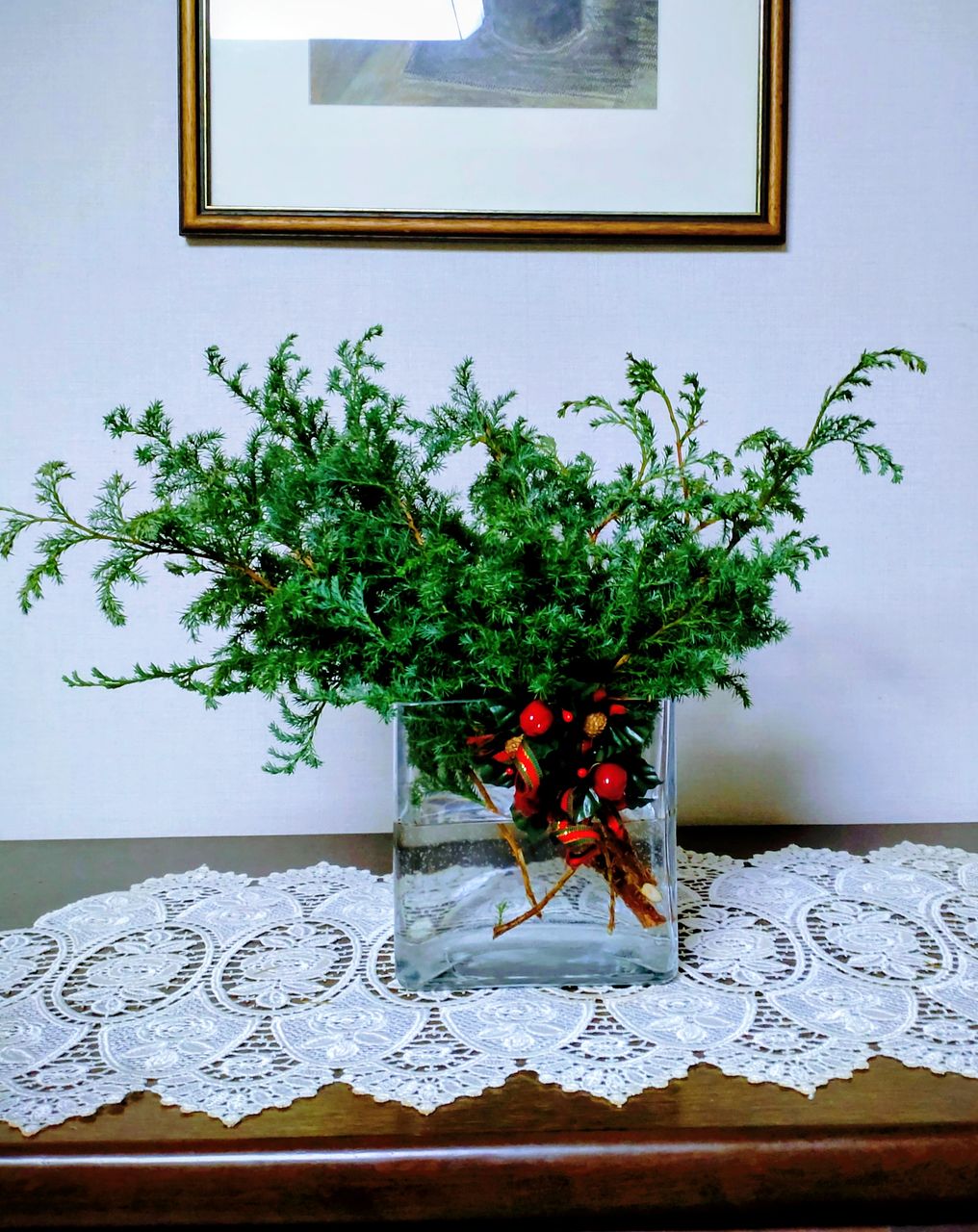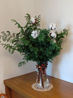 ボリュームたっぷりで新鮮! ありがとうございました 2つの花瓶に生けて、小さめのスワッグも出来ました 家にあったコットンフラワーとオーナメントで、ちょっとだけXmasっほく💖