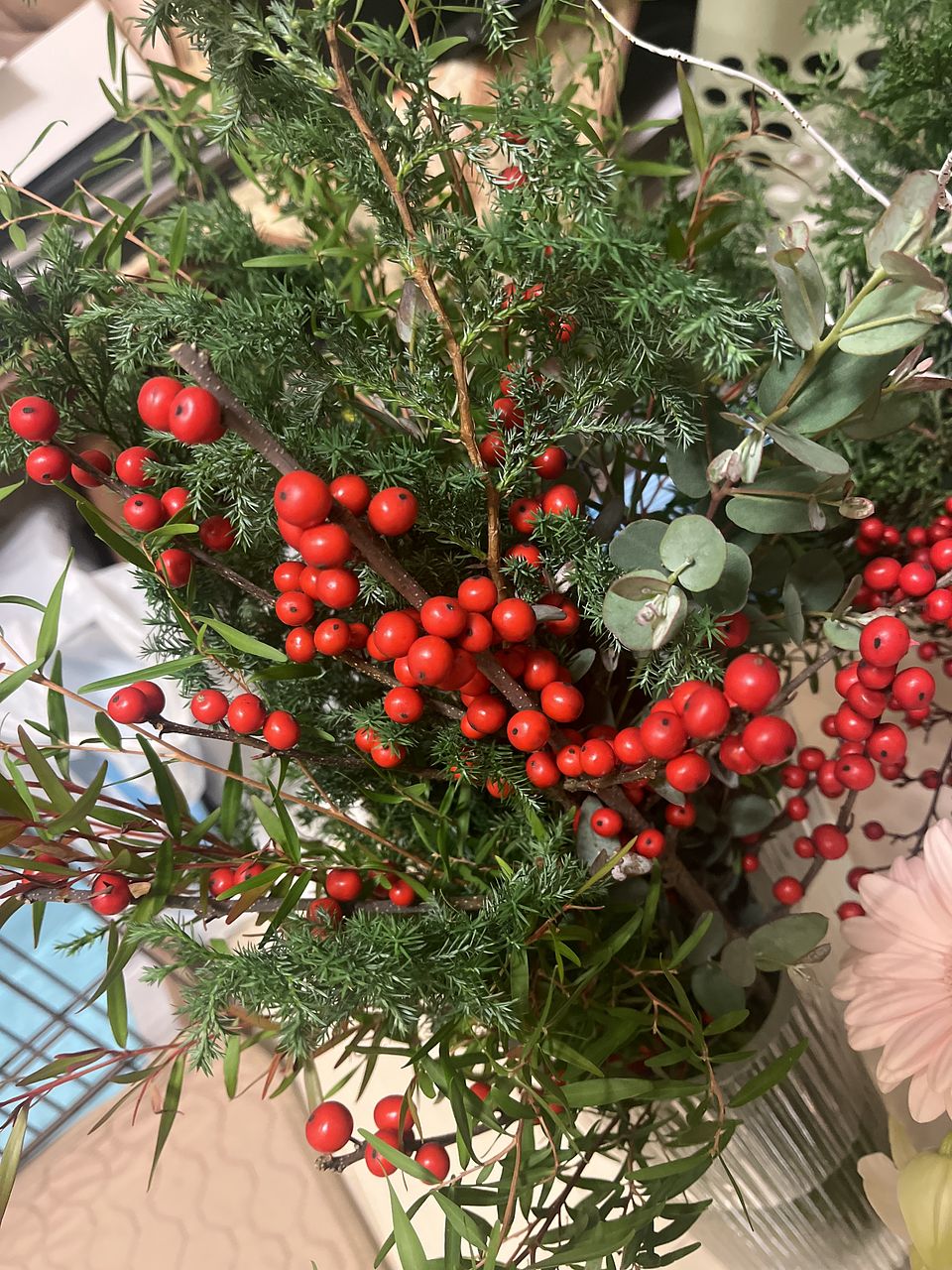 ボリュームがあり、ウィンターベリーの赤い実が沢山付いていてクリスマスぽくて素敵です💕
