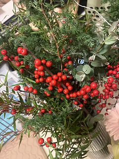 ボリュームもあり 赤い実物もバランスよく入っていて下の方の枝は切って小さな花瓶でトイレや洗面台へ