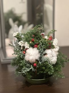 届くのを心待ちにしてました♡ しっかりしたボリュームの材料が届き、大満足な出来栄えです! ヒバなどグリーンのカット✂️が難しく初めてだったので少し時間がかかりましたが、可愛く出来ました。 またリピートしたいです🎄