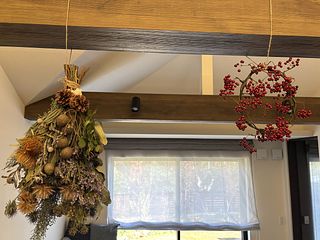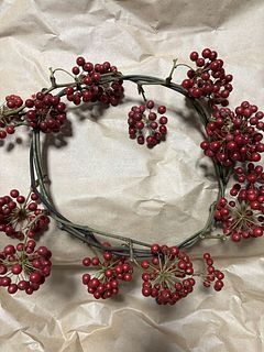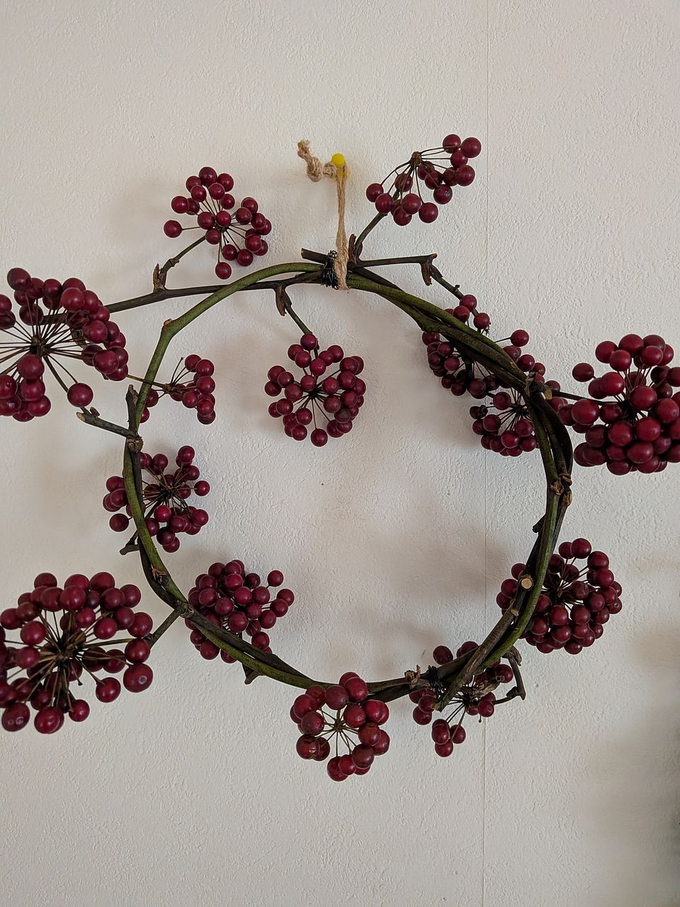 サンキライが大好きで、家にも何個かあります。実がたくさんついたサンキライリースが届いて満足です。 リースは小さめですが、きれいな実がついていました。今年は色づきが悪い物が多いみたいですがきれいに色づいていました。 巻いてあるテープを家にあった黒のワイヤーに変えて麻紐をつけて飾りました。