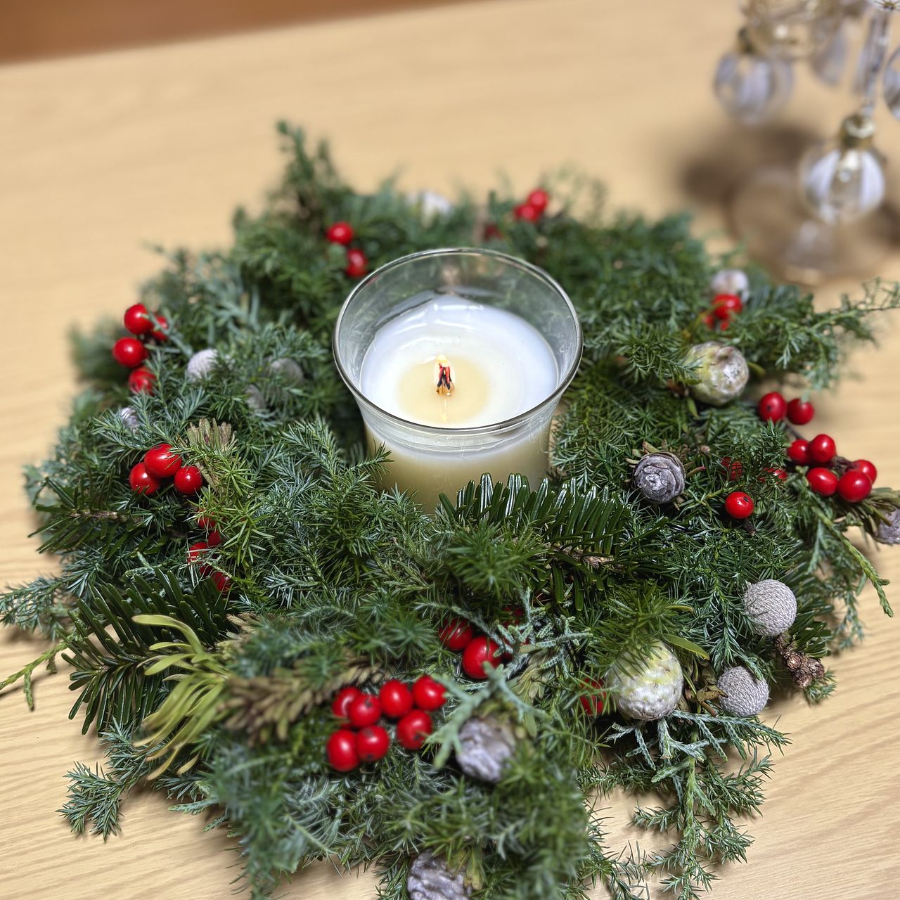 中央にはキャンドルを。火を灯せばやさしい光がリースのグリーンを照らして、まるで森の中の小さな灯りのよう✨