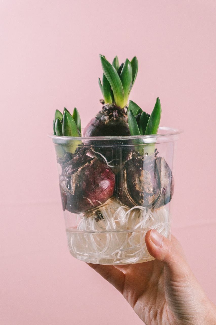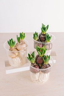 水耕栽培用の花器や、お好きな花器に水苔を敷いて球根をのせるのもおすすめ。