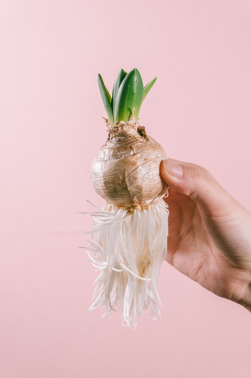 →葉と花の部分を紙でまっすぐになるように巻いて球根の根をしっかり水に浸けてください。