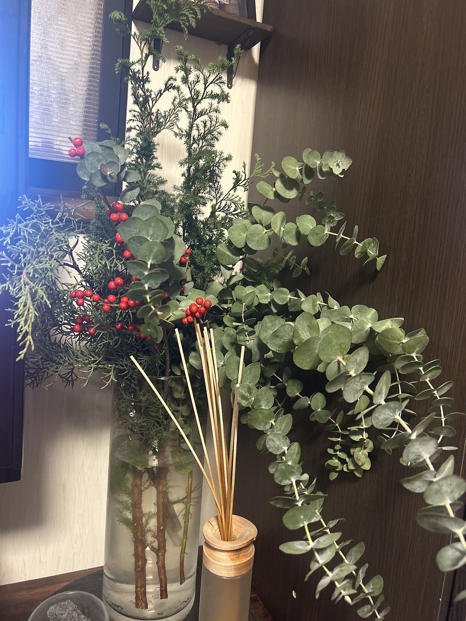 今回セレクトした枝物は、赤い実がかわいい「ウィンターベリー」、ロングサイズの「ひむろ杉」「ブルーアイス」「ユーカリ」と盛りだくさん🌲クリスマスオーナメントを吊るせばお部屋が一気にホリデームードに✨🎁