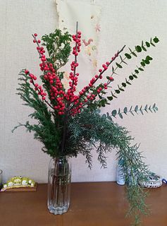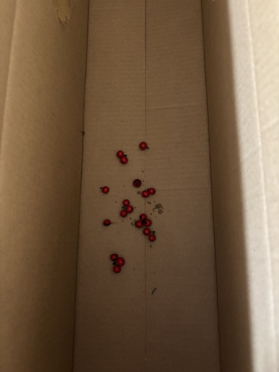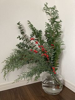 箱を開けた瞬間とてもいい香りが広がった!しかし包み紙を開けてみると赤い実がいくつも落ちていて少し残念だった。 全体的なボリュームはすごいので二つに分けて飾りました。
