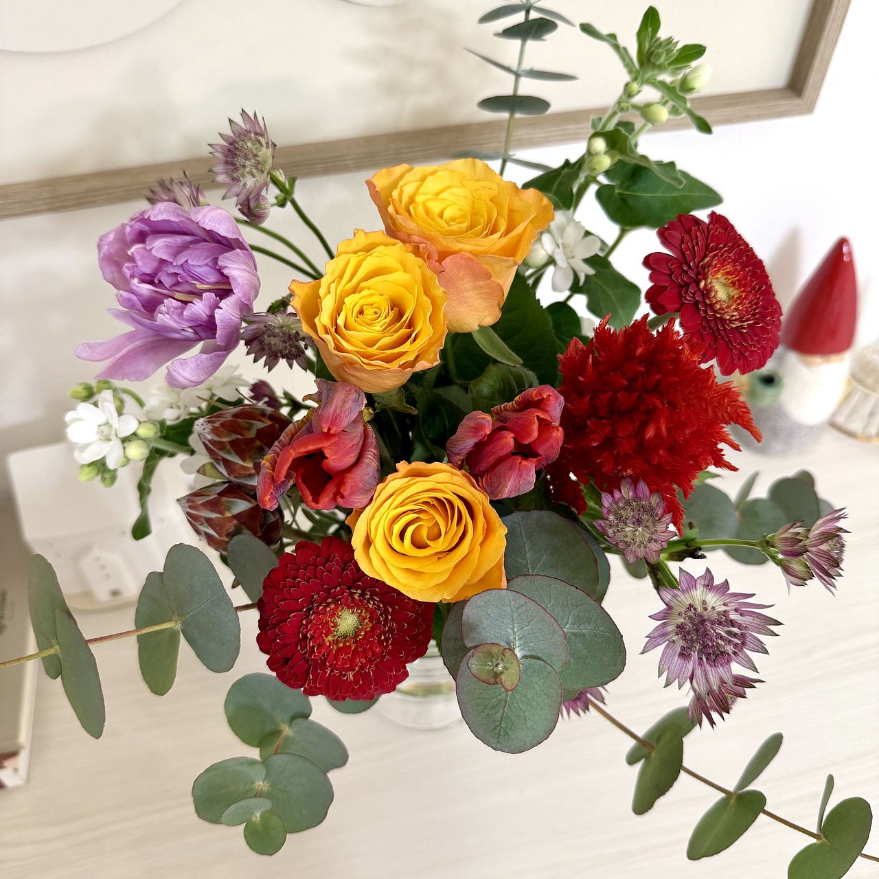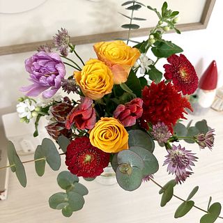 チューリップの他にガーベラなど お花がたくさん入っていて とても華やかでした。 フラワーベースから溢れ出しそうなブーケ✨ お部屋がパッと明るくなりました💖 ありがとうございました。