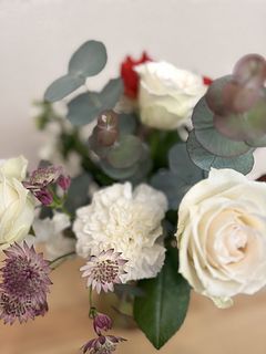ホワイトをベースに赤色とグリーンでクリスマスっぽいかわいいブーケで、とてもかわいいです。 スパイラルブーケは初めてでしたがいろいろなお花楽しめます🌸