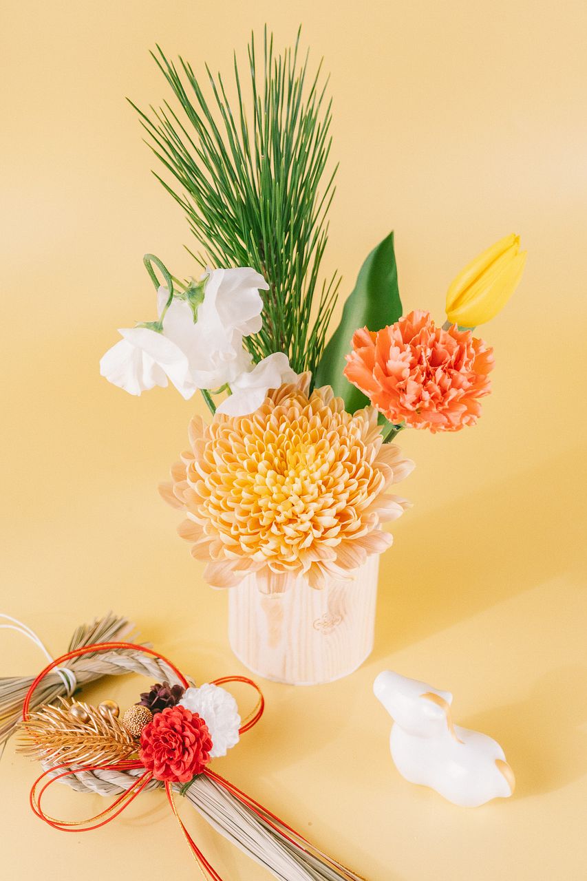 松やデコラ咲きのマム(菊)、チューリップ、スイートピーなど、心が明るくなるお花をチョイスしました🌼