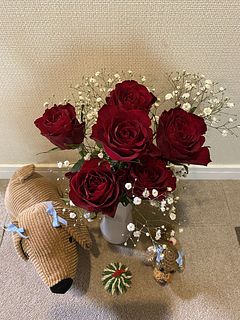 前回はかわいい系のローズを購入したので、今回はクリスマスカラーの赤で大人っぽい空間を作りたくて購入しました。お花は6本あり問題はなかったのですが、バラの葉が到着時かなり元気がなくカラカラになっており、水揚げを2時間しましたが葉はあまり元気がなかったのでかなり外しました。ボリュームが減ってしまったので、グリーンか枝物を追加しようかと考えています。赤い薔薇を購入したのは初めてですが、深い赤が素敵だと思います。花瓶も一緒に購入しました。箱から出した時には大きい!と思いましたが、とても安定感があるので使いやすいと思います。