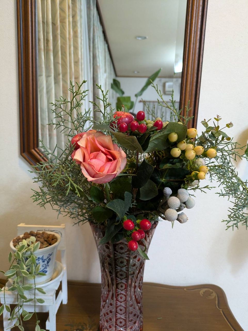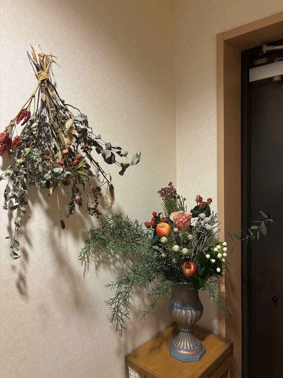この時期毎年リースを作っていたけど、花材が割高で、こちらを購入。まんま活けてもドライにしてスワッグとして飾ってもいい感じで満足です。