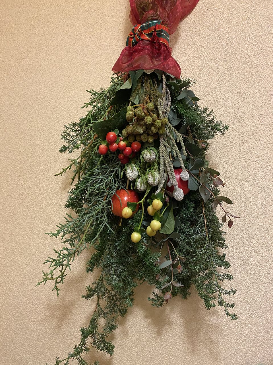 早速スワッグにしてみました! 花材もクリスマスらしく、リンコがアクセントになりかわいく仕上がりました🎄