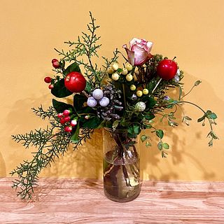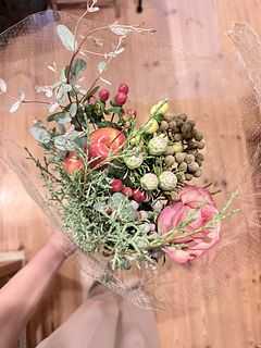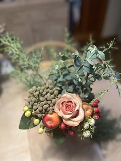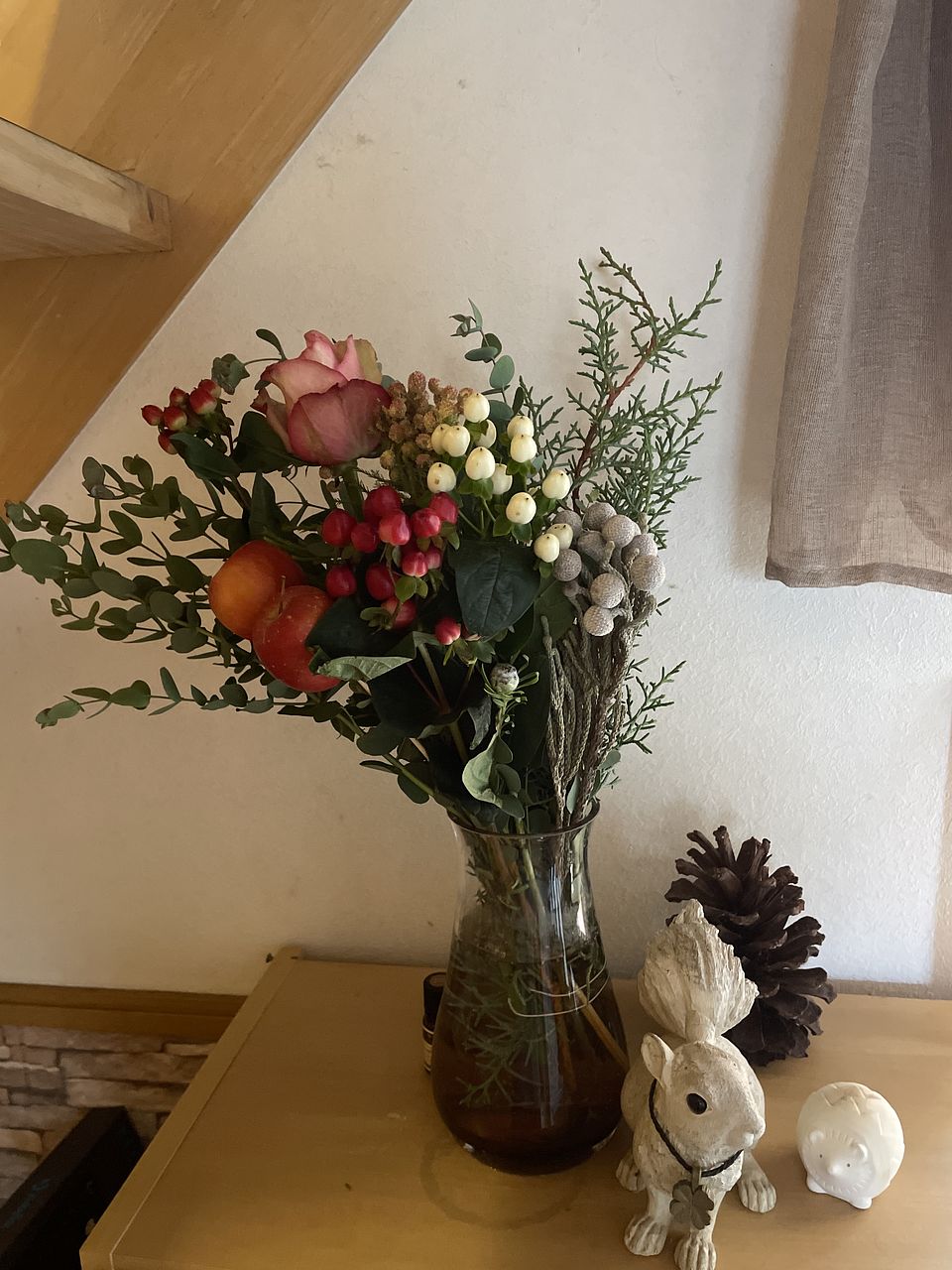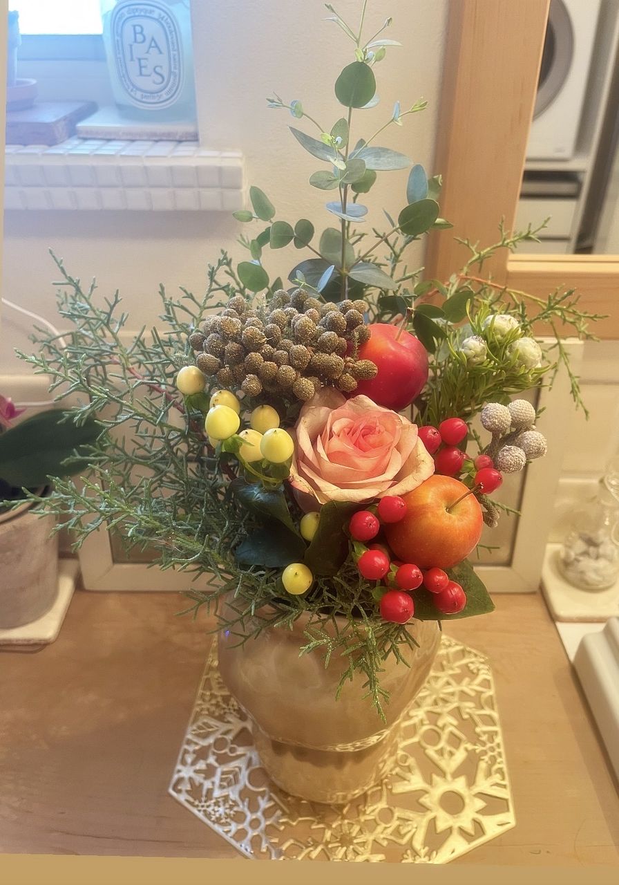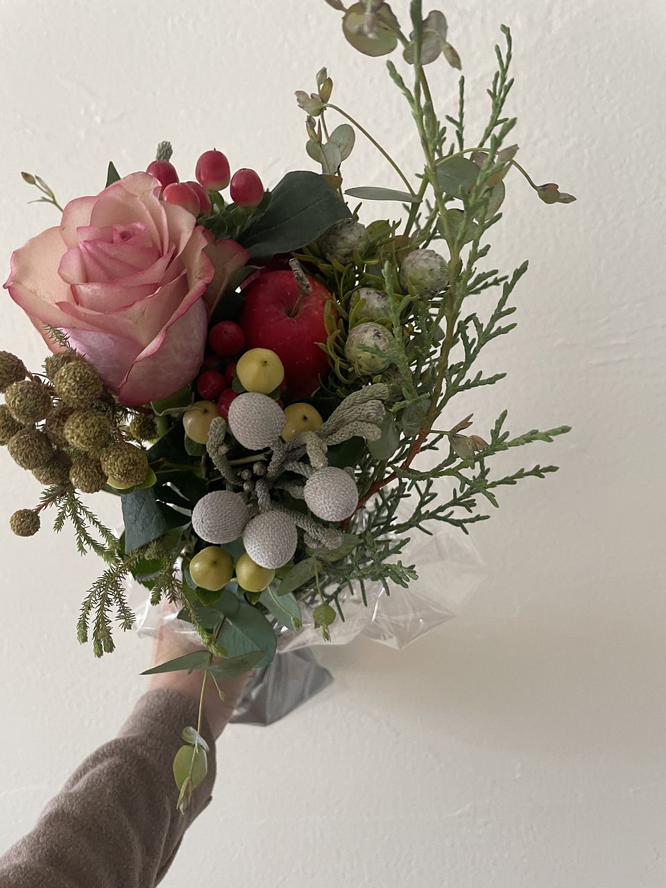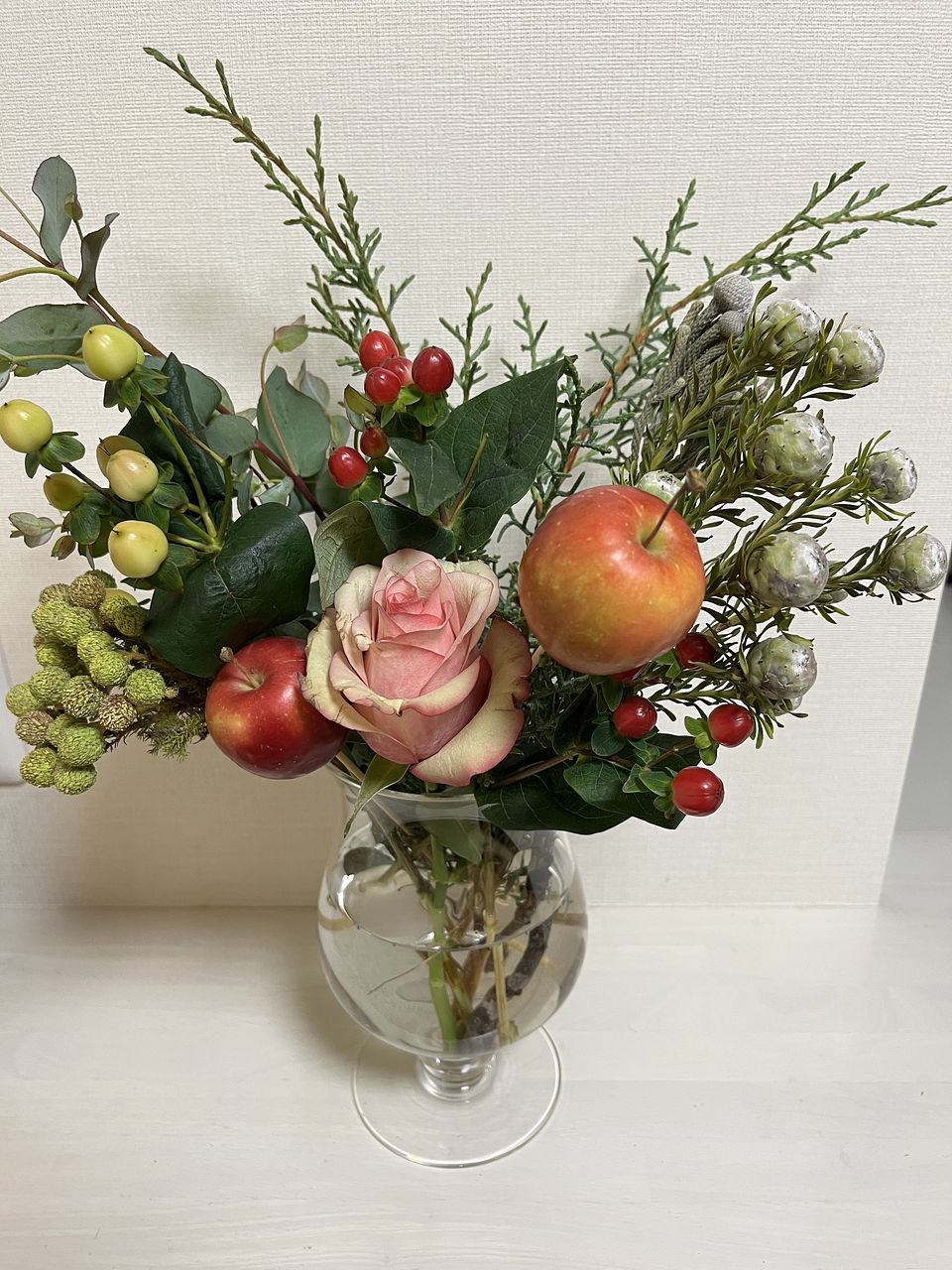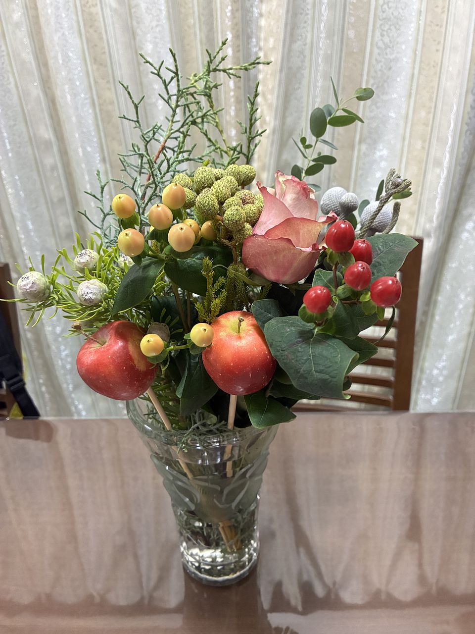 思った通りの素敵なお花が届きました!林檎がかわいくアクセントになっていて、淡い薔薇の色や他のお花や植物と合っていてとても良かったです☺️