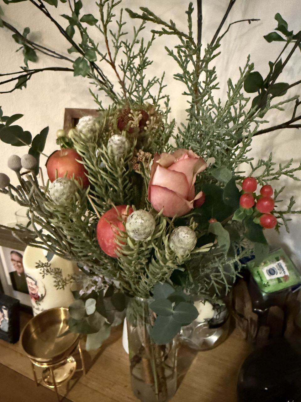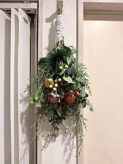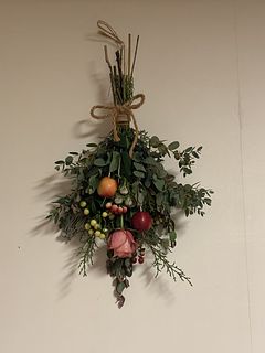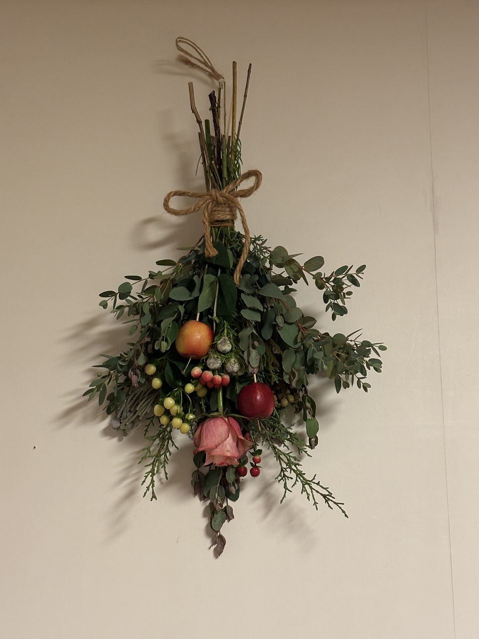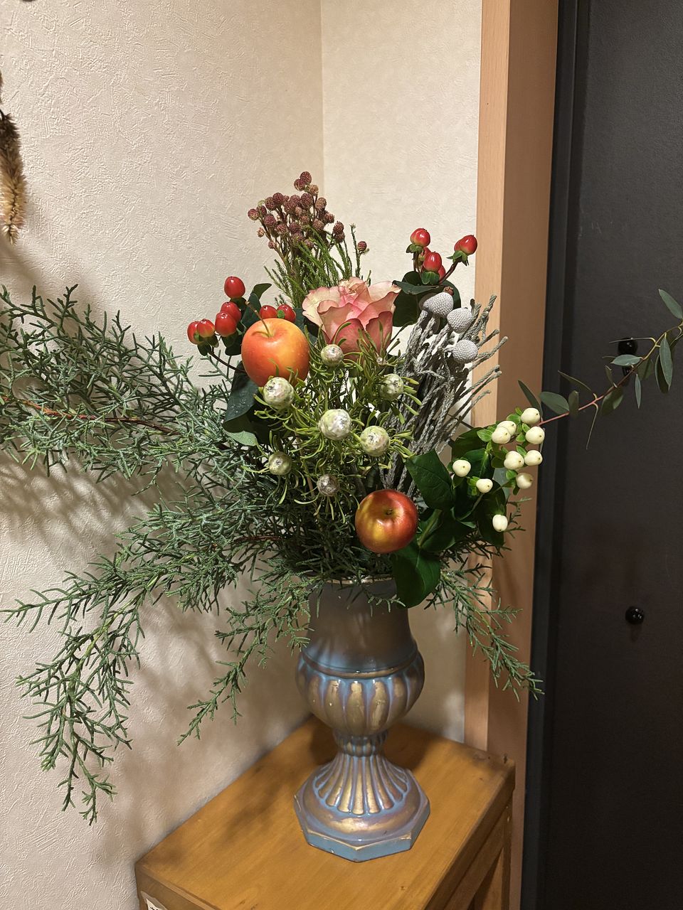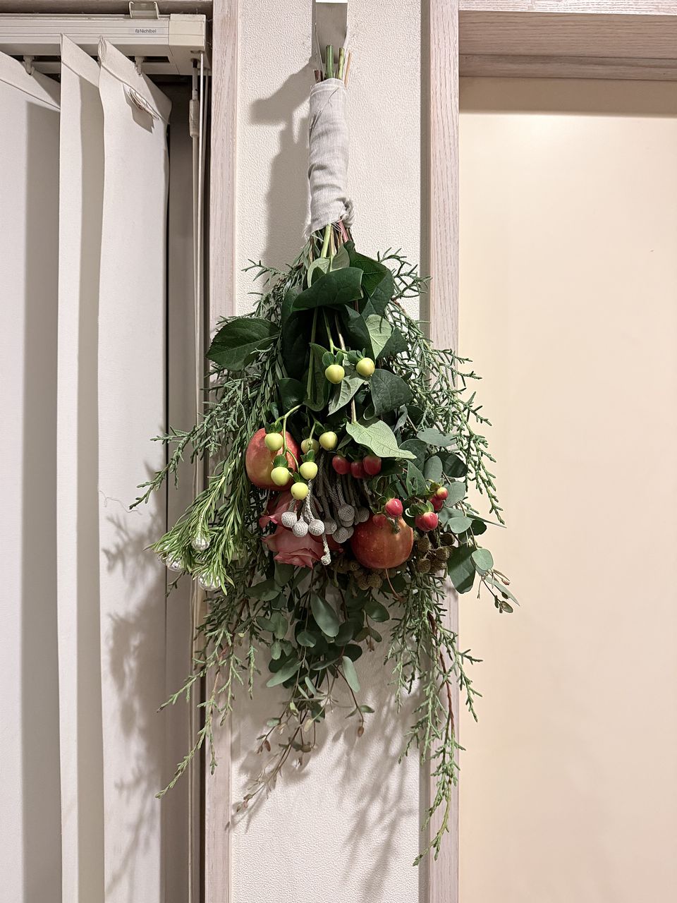 りんごのアクセントがきいていました。香りが、部屋いっぱいに広がり、しばらくは、切り花として、部屋で楽しみ、その後スワッグにする予定です。