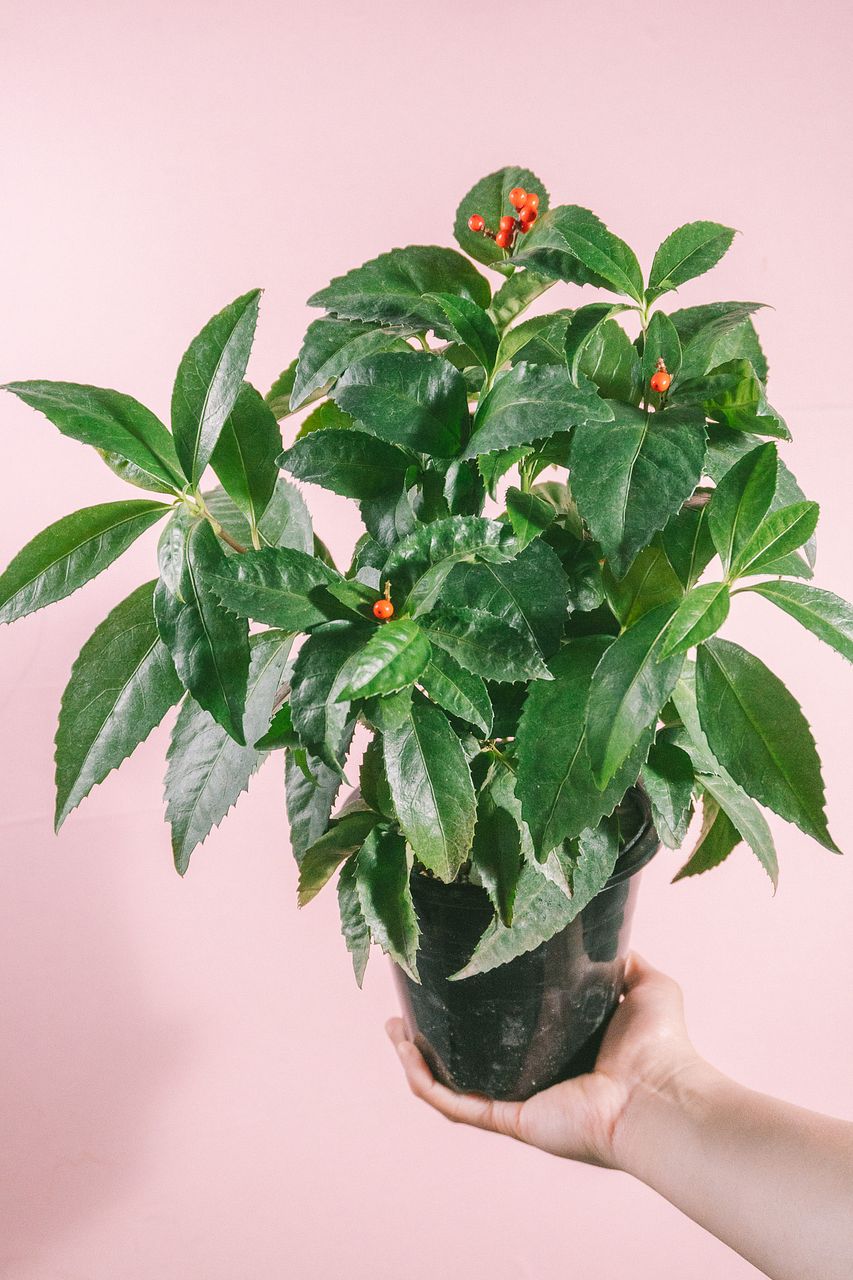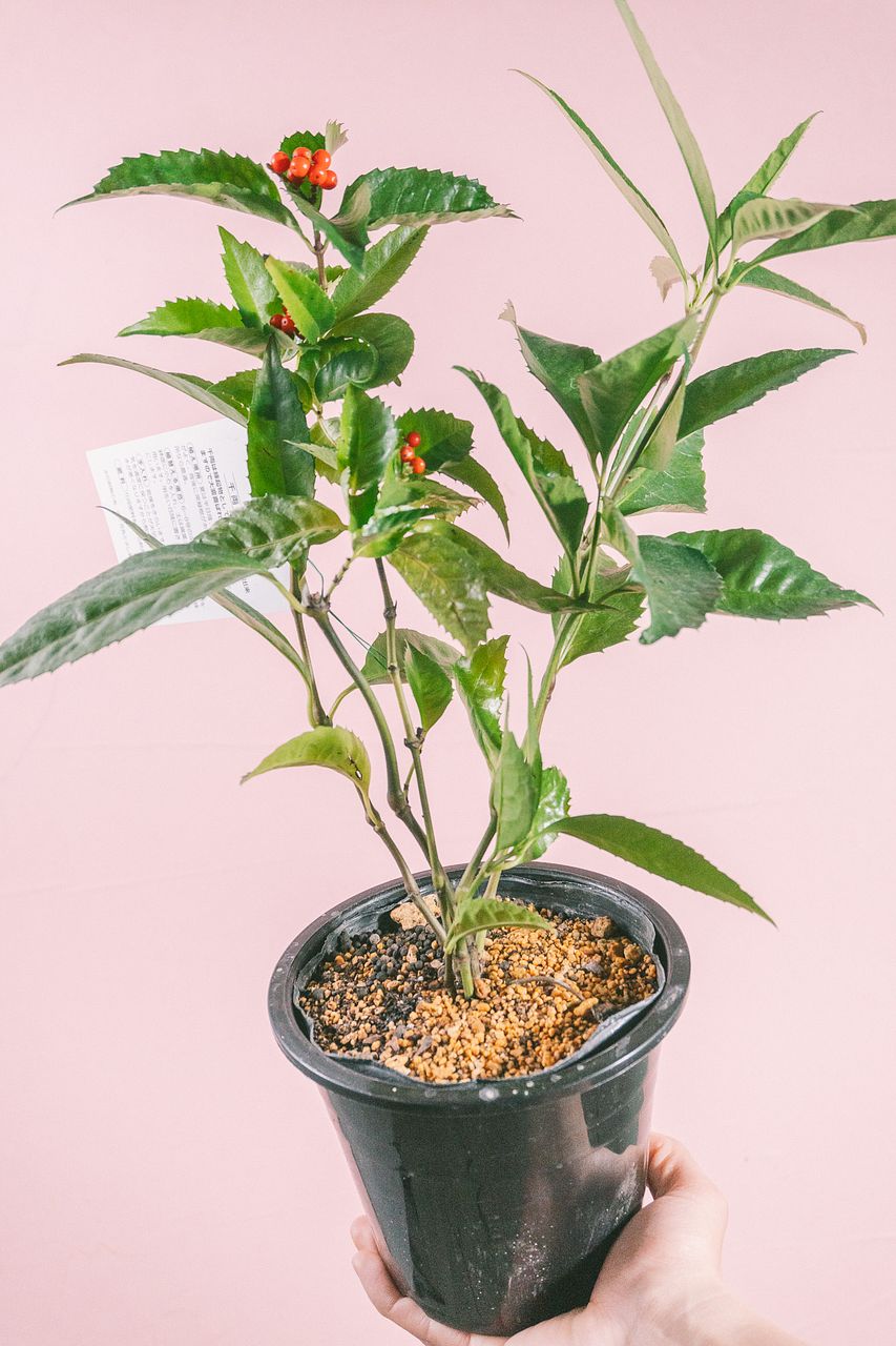 お正月飾りの縁起ものとして、葉形が小判に似ていることから千両と言われ、昔から愛されている枝物です。今回は鉢タイプをご用意してます。花言葉は「利益」「祝福」「富」「財産」。
