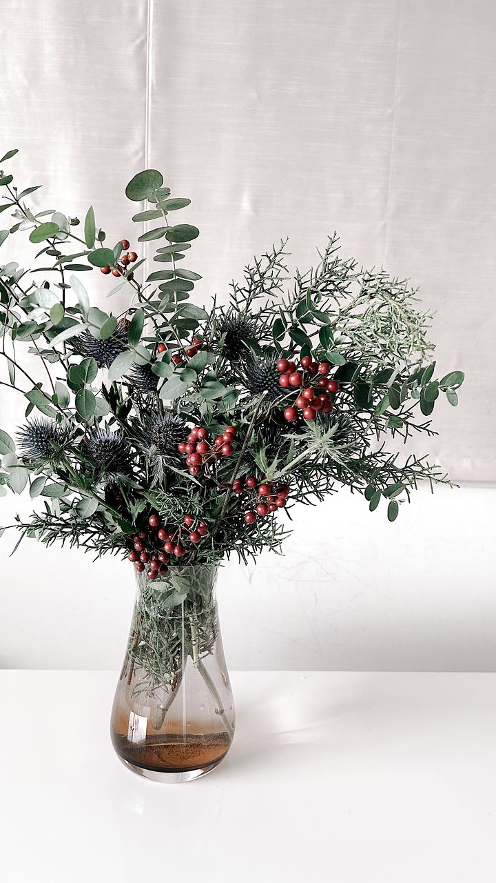 花瓶に生けて生で楽しんでいます。生ける前の剪定で、ヒロム杉やユーカリの爽やかな香りに幸せな気持ちに。エリンジウムのくすんだ青も全体的にグレイッシュな緑色ととてもよく合い、そしてウインターベリーの赤がホリデーシーズン気分を盛り上げてくれました。