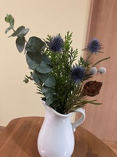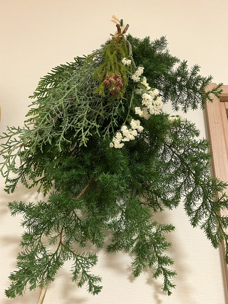 ブルーアイスやにおいひばを中心に、ユーカリやエリンジウムなど、清々しいグリーンと凛とした草花を合わせました。まるで森林の中で眠るような安らぎを感じられるスワッグ🛏️💤